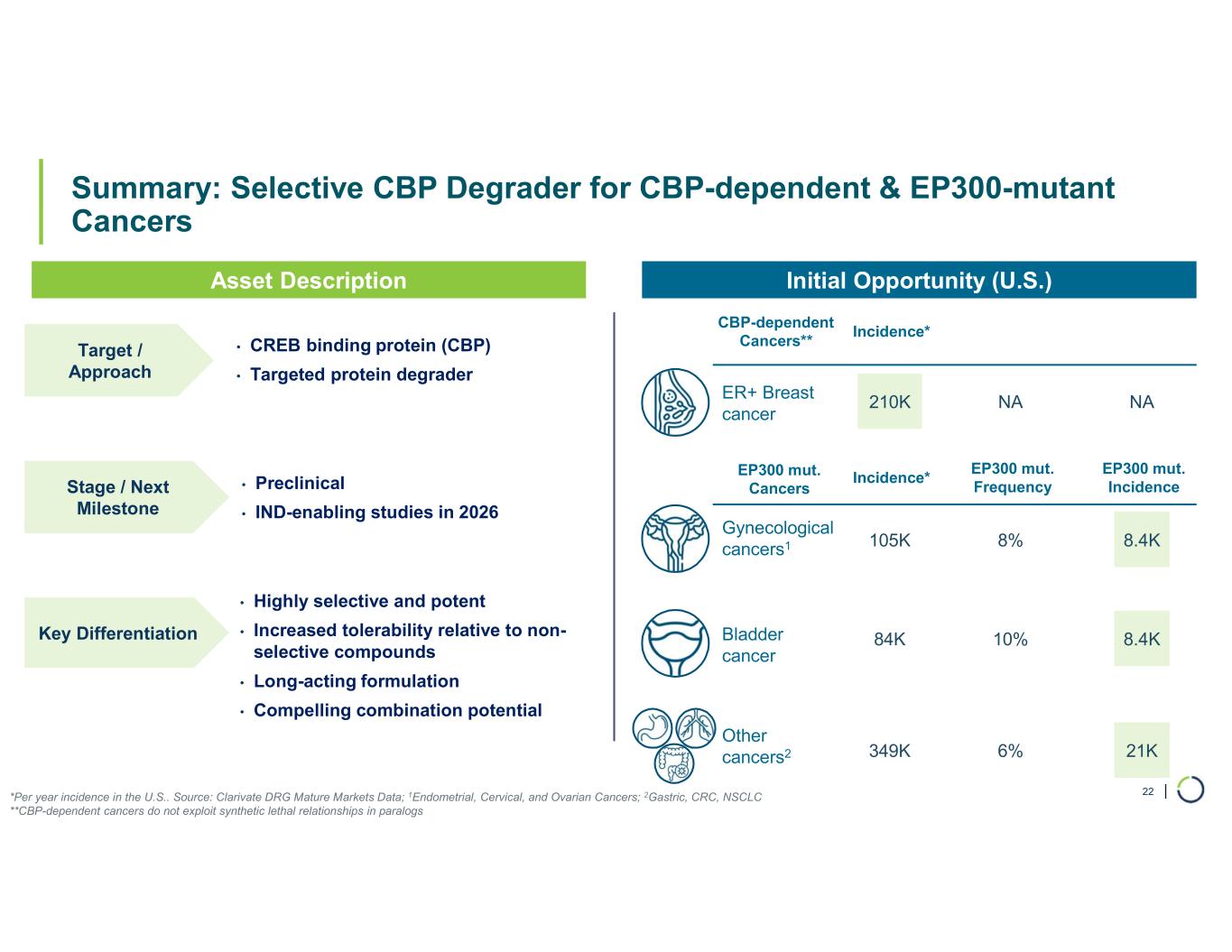 | Summary: Selective CBP Degrader for CBP-dependent & EP300-mutant Cancers 22 • CREB binding protein (CBP) • Targeted protein degrader Gynecological cancers1 Other cancers2 Bladder cancer ER+ Breast cancer Target / Approach • Preclinical • IND-enabling studies in 2026 Stage / Next Milestone • Highly selective and potent • Increased tolerability relative to non- selective compounds • Long-acting formulation • Compelling combination potential Asset Description Initial Opportunity (U.S.) Incidence* EP300 mut. Frequency EP300 mut. Incidence 105K 8% 8.4K 84K 10% 8.4K 349K 6% 21K 210K NA NA *Per year incidence in the U.S.. Source: Clarivate DRG Mature Markets Data; 1Endometrial, Cervical, and Ovarian Cancers; 2Gastric, CRC, NSCLC **CBP-dependent cancers do not exploit synthetic lethal relationships in paralogs EP300 mut. Cancers CBP-dependent Cancers** Incidence* Key Differentiation