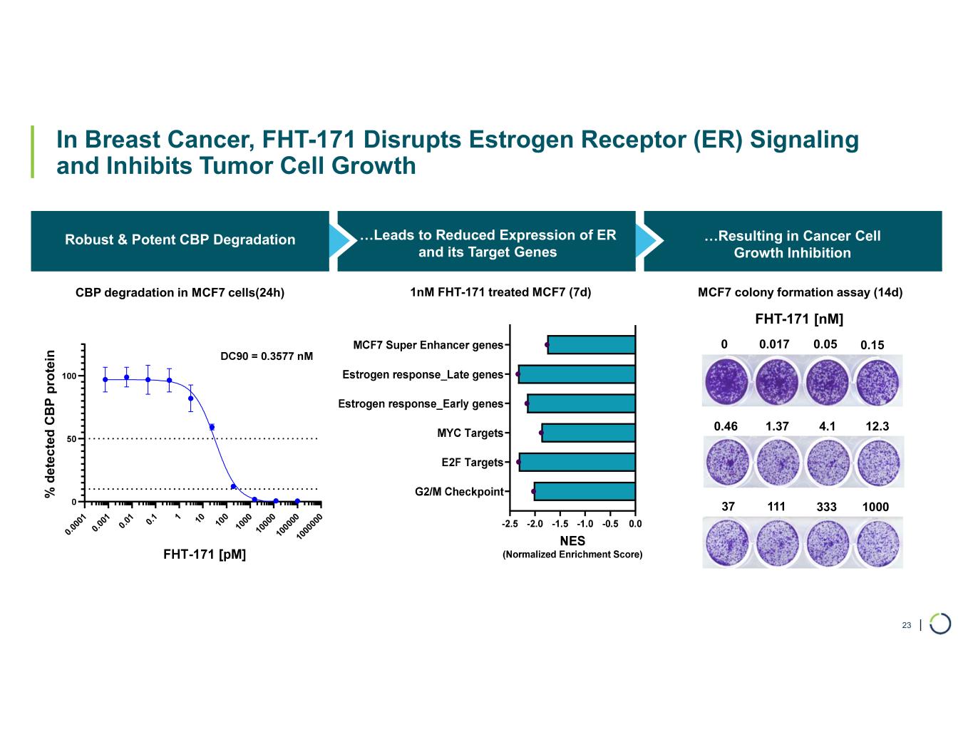 | In Breast Cancer, FHT-171 Disrupts Estrogen Receptor (ER) Signaling and Inhibits Tumor Cell Growth Robust & Potent CBP Degradation …Resulting in Cancer Cell Growth Inhibition 23 0. 00 01 0. 00 1 0. 01 0. 1 1 10 10 0 10 00 10 00 0 10 00 00 10 00 00 0 % d e te c te d C B P p ro te in CBP degradation in MCF7 cells(24h) …Leads to Reduced Expression of ER and its Target Genes MCF7 colony formation assay (14d) 33311137 12.34.11.370.46 0.150.050.017 1000 0 FHT-171 [nM] 1nM FHT-171 treated MCF7 (7d)