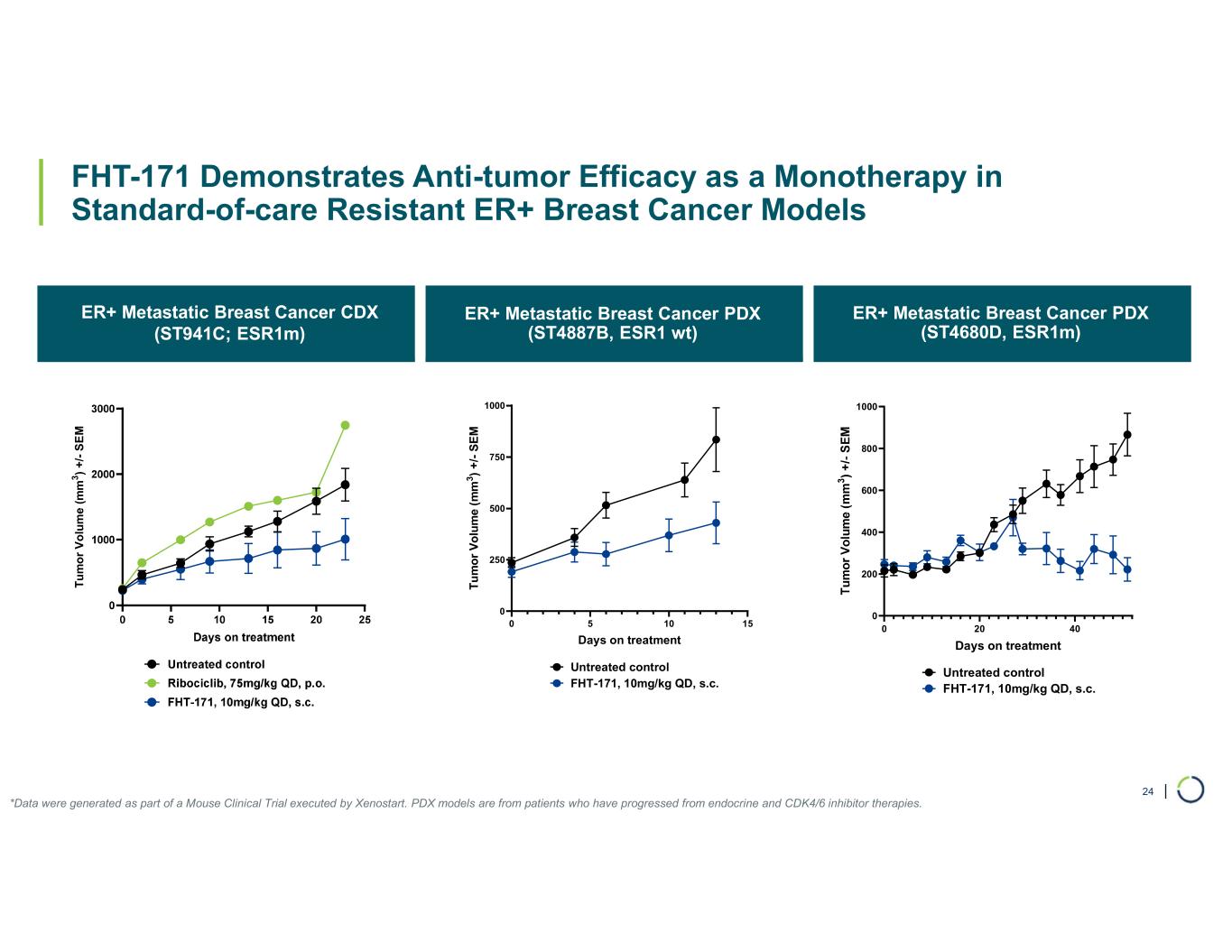 | FHT-171 Demonstrates Anti-tumor Efficacy as a Monotherapy in Standard-of-care Resistant ER+ Breast Cancer Models ER+ Metastatic Breast Cancer CDX (ST941C; ESR1m) ER+ Metastatic Breast Cancer PDX (ST4887B, ESR1 wt) ER+ Metastatic Breast Cancer PDX (ST4680D, ESR1m) 24 T u m o r V o lu m e (m m 3 ) + /- S E M *Data were generated as part of a Mouse Clinical Trial executed by Xenostart. PDX models are from patients who have progressed from endocrine and CDK4/6 inhibitor therapies. 0 20 40 0 200 400 600 800 1000 Days on treatment Untreated control FHT-171, 10mg/kg QD, s.c. 0 5 10 15 0 250 500 750 1000 Days on treatment T u m o r V o lu m e ( m m 3 ) + /- S E M Untreated control FHT-171, 10mg/kg QD, s.c.