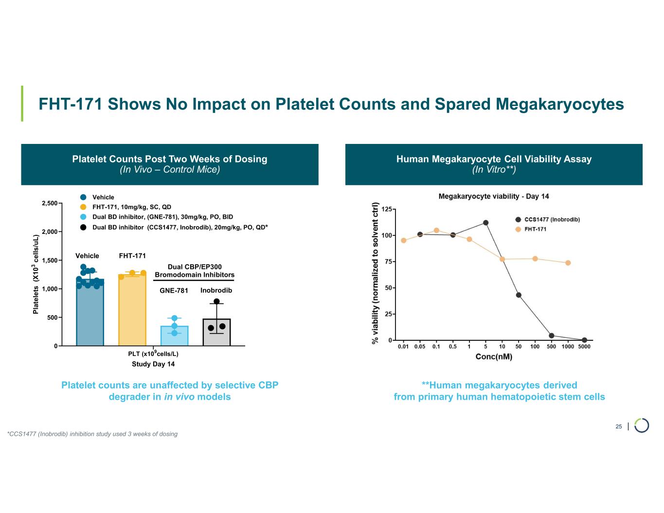 | FHT-171 Shows No Impact on Platelet Counts and Spared Megakaryocytes • C B P Platelet Counts Post Two Weeks of Dosing (In Vivo – Control Mice) Human Megakaryocyte Cell Viability Assay (In Vitro**) *CCS1477 (Inobrodib) inhibition study used 3 weeks of dosing Platelet counts are unaffected by selective CBP degrader in in vivo models **Human megakaryocytes derived from primary human hematopoietic stem cells 25 PLT (x109cells/L) 0 500 1,000 1,500 2,000 2,500 Study Day 14 P la te le ts (X 1 0 3 c e ll s /u L ) Vehicle FHT-171, 10mg/kg, SC, QD Dual BD inhibitor, (GNE-781), 30mg/kg, PO, BID FHT-171 Dual CBP/EP300 Bromodomain Inhibitors Vehicle Dual BD inhibitor (CCS1477, Inobrodib), 20mg/kg, PO, QD GNE-781 Inobrodib *
