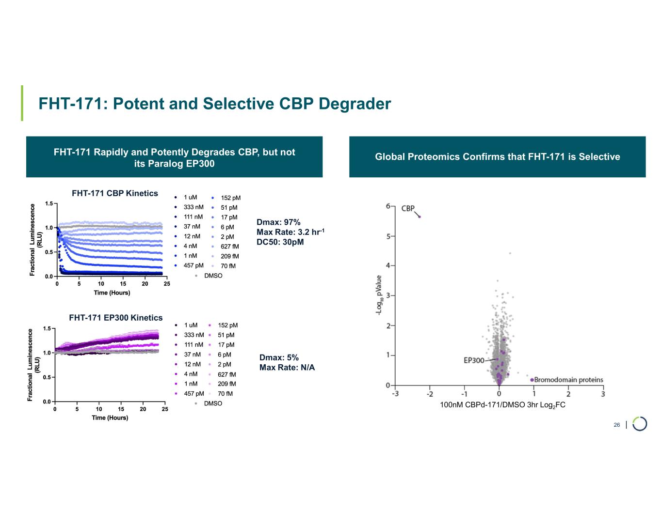 | FHT-171: Potent and Selective CBP Degrader • C B P Global Proteomics Confirms that FHT-171 is Selective 26 FHT-171 Rapidly and Potently Degrades CBP, but not its Paralog EP300 Dmax: 97% Max Rate: 3.2 hr-1 DC50: 30pM Dmax: 5% Max Rate: N/A 100nM CBPd-171/DMSO 3hr Log2FC FHT-171 CBP Kinetics FHT-171 EP300 Kinetics