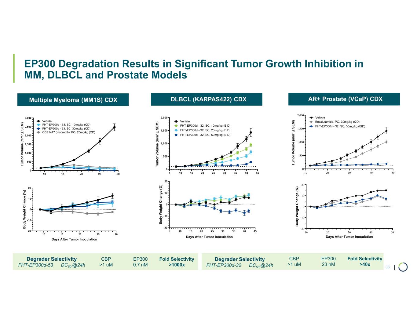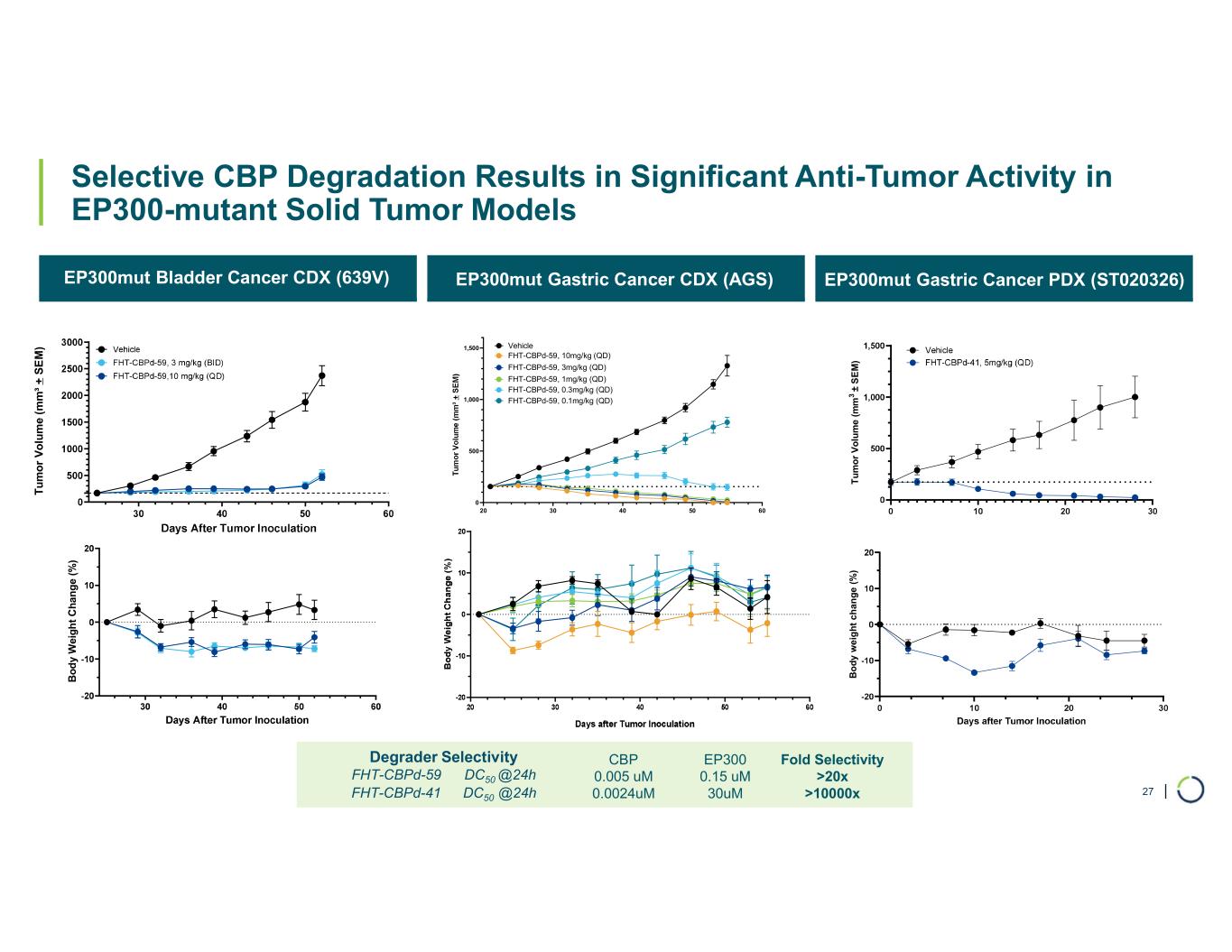| Selective CBP Degradation Results in Significant Anti-Tumor Activity in EP300-mutant Solid Tumor Models EP300mut Bladder Cancer CDX (639V) EP300mut Gastric Cancer CDX (AGS) EP300mut Gastric Cancer PDX (ST020326) T u m o r V o lu m e (m m ³ + S E M ) B o d y W ei g h t C h an g e (% ) 20 30 40 50 60 0 500 1,000 1,500 Vehicle FHT-CBPd-59, 10mg/kg (QD) FHT-CBPd-59, 3mg/kg (QD) FHT-CBPd-59, 1mg/kg (QD) FHT-CBPd-59, 0.3mg/kg (QD) FHT-CBPd-59, 0.1mg/kg (QD) T u m o r V o lu m e ( m m 3 ± S E M ) B o d y w e ig h t c h a n g e ( % ) Fold Selectivity >20x >10000x EP300 0.15 uM 30uM CBP 0.005 uM 0.0024uM Degrader Selectivity FHT-CBPd-59 DC50 @24h FHT-CBPd-41 DC50 @24h 27