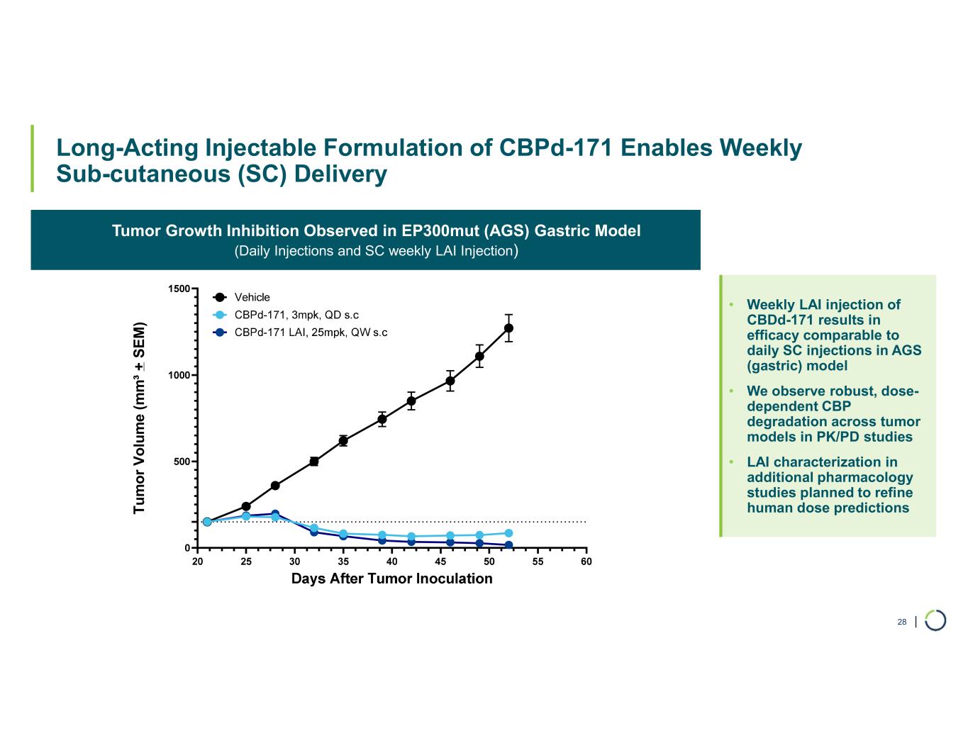 | Long-Acting Injectable Formulation of CBPd-171 Enables Weekly Sub-cutaneous (SC) Delivery 28 Tumor Growth Inhibition Observed in EP300mut (AGS) Gastric Model (Daily Injections and SC weekly LAI Injection) • Weekly LAI injection of CBDd-171 results in efficacy comparable to daily SC injections in AGS (gastric) model • We observe robust, dose- dependent CBP degradation across tumor models in PK/PD studies • LAI characterization in additional pharmacology studies planned to refine human dose predictionsT u m o r V o lu m e (m m ³ + S E M )