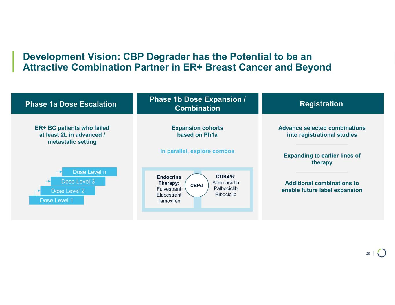 | 29 Development Vision: CBP Degrader has the Potential to be an Attractive Combination Partner in ER+ Breast Cancer and Beyond Phase 1b Dose Expansion / Combination ER+ BC patients who failed at least 2L in advanced / metastatic setting In parallel, explore combos Dose Level 1 Dose Level 2 Dose Level 3 Dose Level n Expansion cohorts based on Ph1a Advance selected combinations into registrational studies Expanding to earlier lines of therapy Additional combinations to enable future label expansion Endocrine Therapy: Fulvestrant Elacestrant Tamoxifen CDK4/6: Abemaciclib Palbociclib Ribociclib CBPd Phase 1a Dose Escalation Registration