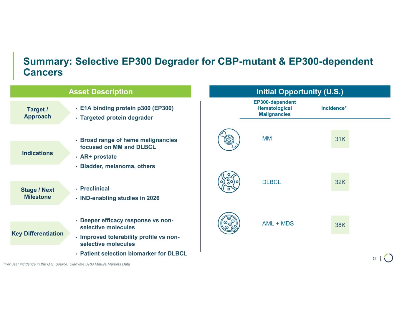 | Summary: Selective EP300 Degrader for CBP-mutant & EP300-dependent Cancers 31 • E1A binding protein p300 (EP300) • Targeted protein degrader MM AML + MDS DLBCL Target / Approach • Preclinical • IND-enabling studies in 2026 Stage / Next Milestone • Deeper efficacy response vs non- selective molecules • Improved tolerability profile vs non- selective molecules • Patient selection biomarker for DLBCL Asset Description Initial Opportunity (U.S.) Incidence* 31K 32K 38K *Per year incidence in the U.S. Source: Clarivate DRG Mature Markets Data EP300-dependent Hematological Malignancies Key Differentiation • Broad range of heme malignancies focused on MM and DLBCL • AR+ prostate • Bladder, melanoma, others Indications