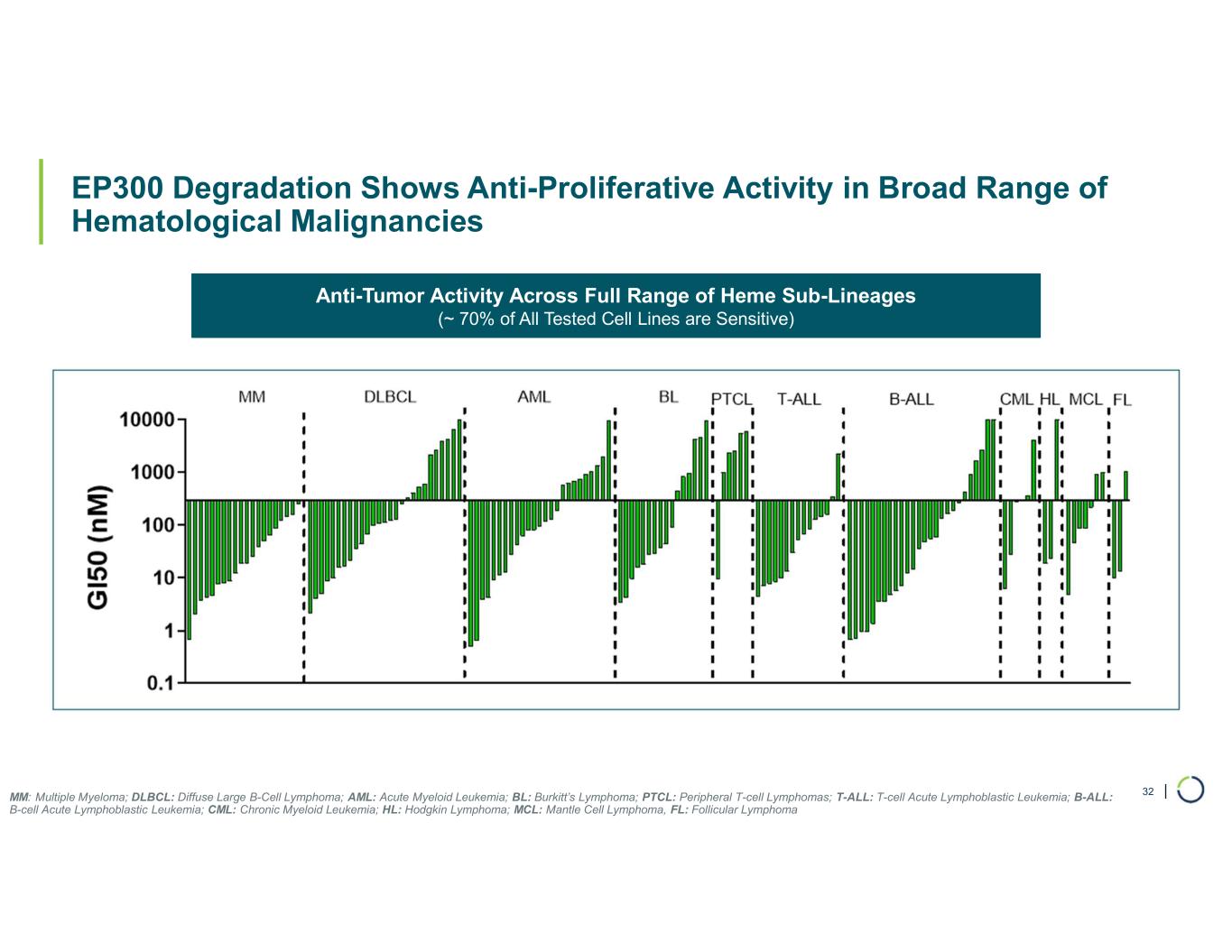 | EP300 Degradation Shows Anti-Proliferative Activity in Broad Range of Hematological Malignancies 32MM: Multiple Myeloma; DLBCL: Diffuse Large B-Cell Lymphoma; AML: Acute Myeloid Leukemia; BL: Burkitt’s Lymphoma; PTCL: Peripheral T-cell Lymphomas; T-ALL: T-cell Acute Lymphoblastic Leukemia; B-ALL: B-cell Acute Lymphoblastic Leukemia; CML: Chronic Myeloid Leukemia; HL: Hodgkin Lymphoma; MCL: Mantle Cell Lymphoma, FL: Follicular Lymphoma Anti-Tumor Activity Across Full Range of Heme Sub-Lineages (~ 70% of All Tested Cell Lines are Sensitive)