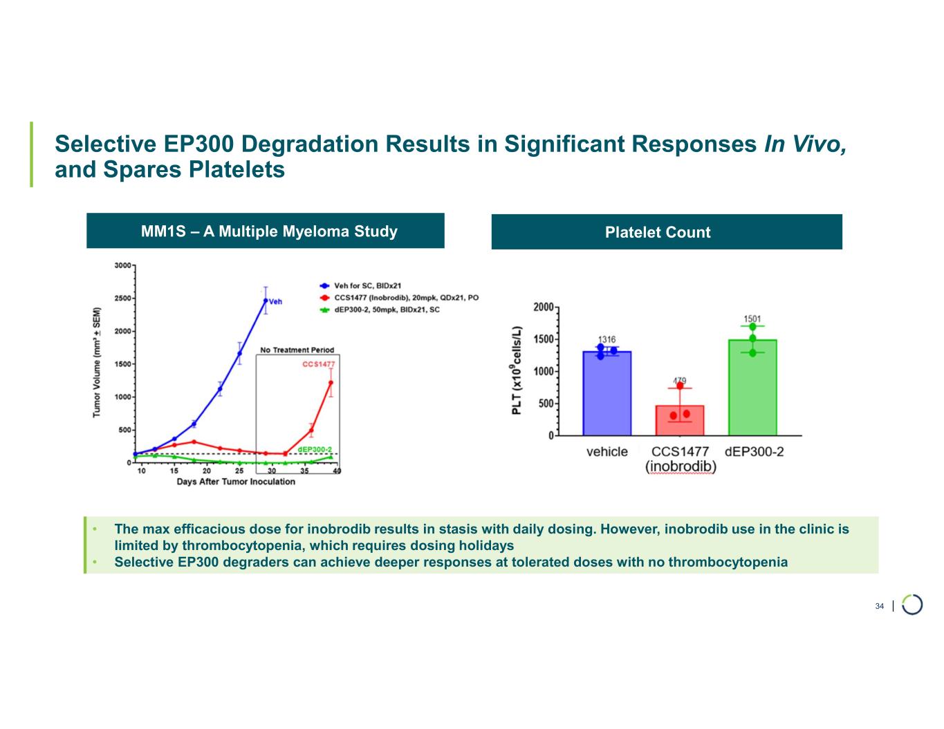 | Selective EP300 Degradation Results in Significant Responses In Vivo, and Spares Platelets 34 • The max efficacious dose for inobrodib results in stasis with daily dosing. However, inobrodib use in the clinic is limited by thrombocytopenia, which requires dosing holidays • Selective EP300 degraders can achieve deeper responses at tolerated doses with no thrombocytopenia MM1S – A Multiple Myeloma Study Platelet Count