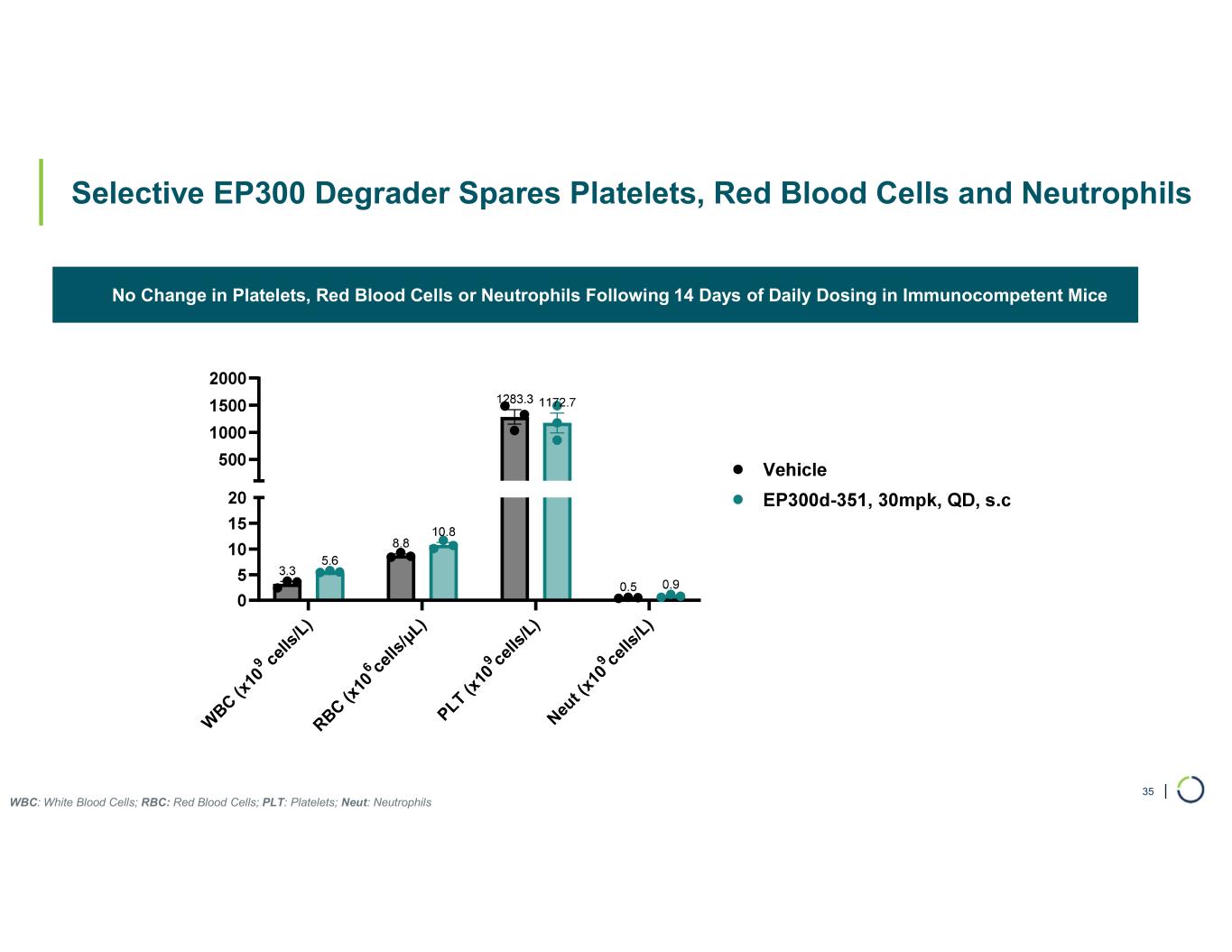 | Selective EP300 Degrader Spares Platelets, Red Blood Cells and Neutrophils No Change in Platelets, Red Blood Cells or Neutrophils Following 14 Days of Daily Dosing in Immunocompetent Mice 35 WBC: White Blood Cells; RBC: Red Blood Cells; PLT: Platelets; Neut: Neutrophils W BC (x 10 9 ce lls /L ) RBC (x 10 6 ce lls /μ L) PLT (x 10 9 ce lls /L ) Neu t ( x1 0 9 ce lls /L )