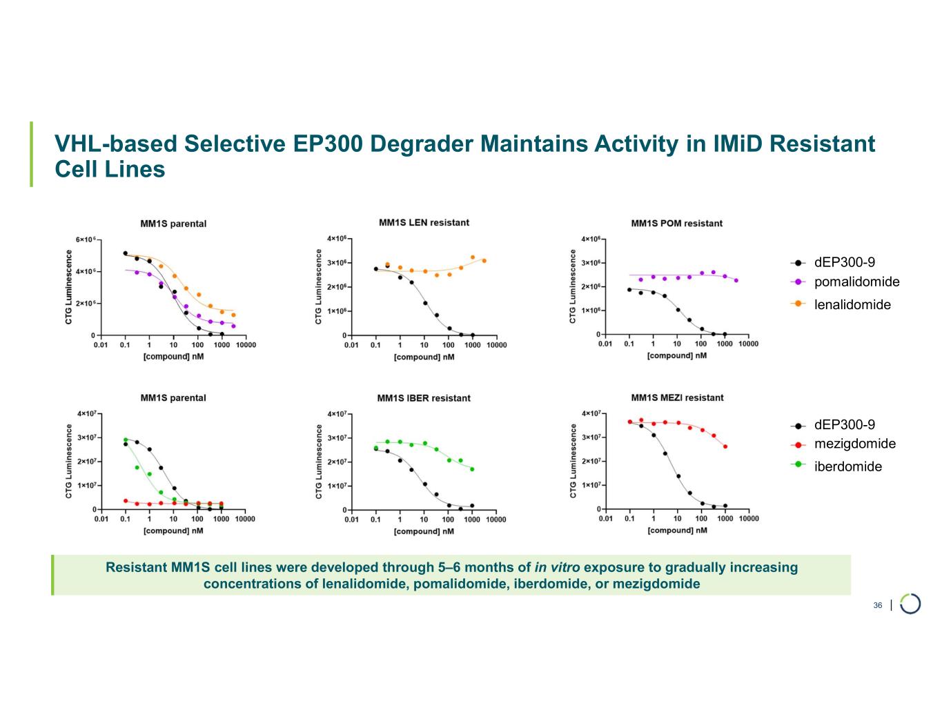| VHL-based Selective EP300 Degrader Maintains Activity in IMiD Resistant Cell Lines 36 Resistant MM1S cell lines were developed through 5–6 months of in vitro exposure to gradually increasing concentrations of lenalidomide, pomalidomide, iberdomide, or mezigdomide dEP300-9 dEP300-9 pomalidomide lenalidomide mezigdomide iberdomide