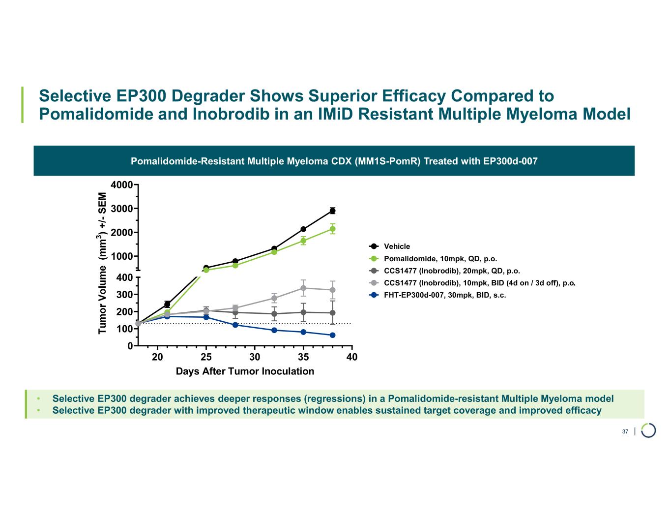 | 20 25 30 35 40 0 100 200 300 400 1000 2000 3000 4000 Days After Tumor Inoculation Vehicle FHT-EP300d-007, 30mpk, BID, s.c. CCS1477 (Inobrodib), 10mpk, BID (4d on / 3d off), p.o CCS1477 (Inobrodib), 20mpk, QD, p.o. Pomalidomide, 10mpk, QD, p.o. Selective EP300 Degrader Shows Superior Efficacy Compared to Pomalidomide and Inobrodib in an IMiD Resistant Multiple Myeloma Model Pomalidomide-Resistant Multiple Myeloma CDX (MM1S-PomR) Treated with EP300d-007 37 • Selective EP300 degrader achieves deeper responses (regressions) in a Pomalidomide-resistant Multiple Myeloma model • Selective EP300 degrader with improved therapeutic window enables sustained target coverage and improved efficacy .