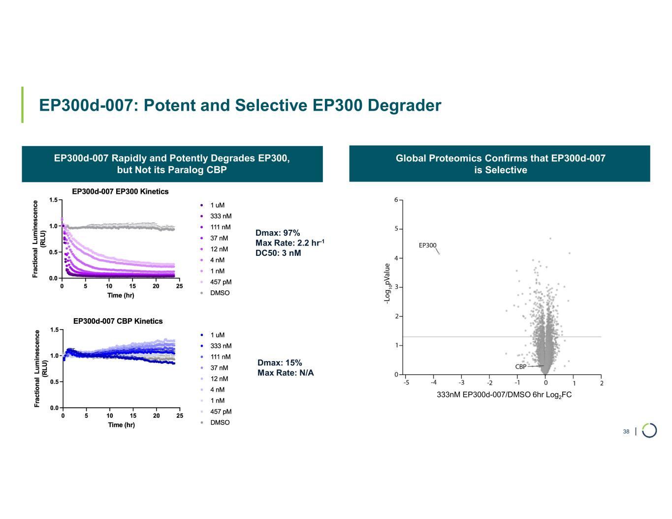 | EP300d-007: Potent and Selective EP300 Degrader EP300d-007 Rapidly and Potently Degrades EP300, but Not its Paralog CBP Global Proteomics Confirms that EP300d-007 is Selective 38 Dmax: 97% Max Rate: 2.2 hr-1 DC50: 3 nM 333nM EP300d-007/DMSO 6hr Log2FC Dmax: 15% Max Rate: N/A