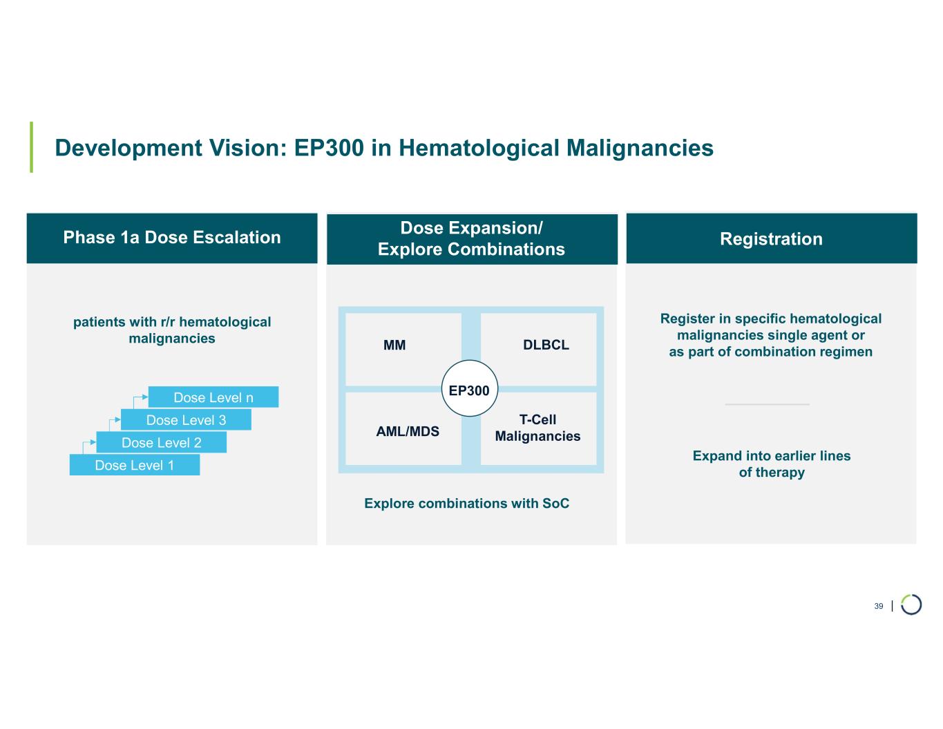 | 39 Development Vision: EP300 in Hematological Malignancies e patients with r/r hematological malignancies Dose Level 1 Dose Level 2 Dose Level 3 Dose Level n Register in specific hematological malignancies single agent or as part of combination regimen AML/MDS T-Cell Malignancies Expand into earlier lines of therapy MM DLBCL EP300 Explore combinations with SoC Phase 1a Dose Escalation Dose Expansion/ Explore Combinations Registration