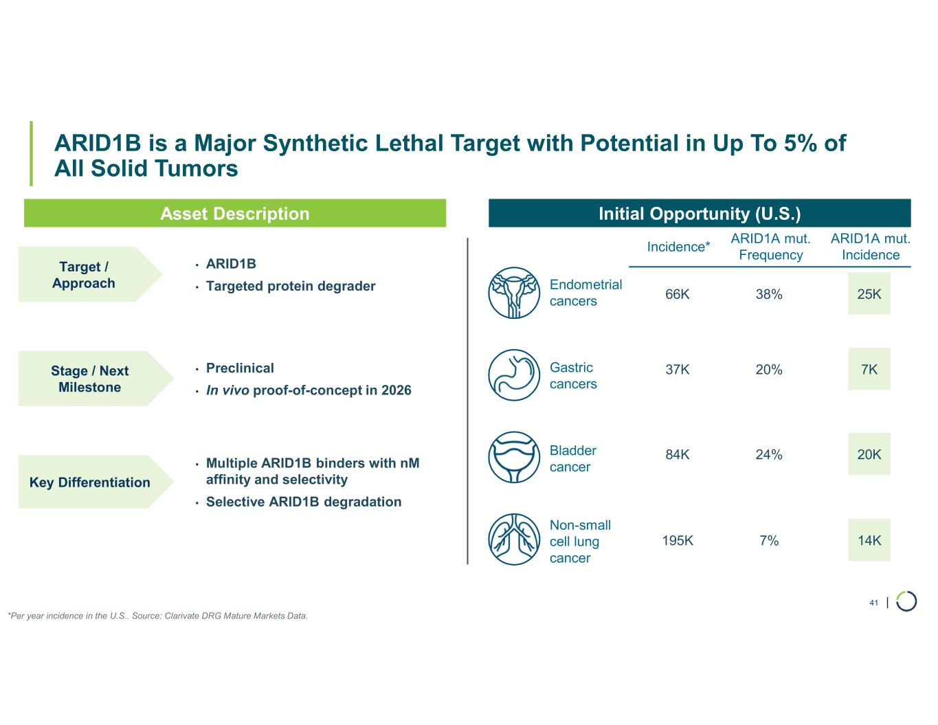 | ARID1B is a Major Synthetic Lethal Target with Potential in Up To 5% of All Solid Tumors 41 • ARID1B • Targeted protein degrader Endometrial cancers Gastric cancers Bladder cancer Non-small cell lung cancer • Preclinical • In vivo proof-of-concept in 2026 • Multiple ARID1B binders with nM affinity and selectivity • Selective ARID1B degradation Asset Description Initial Opportunity (U.S.) Incidence* ARID1A mut. Frequency ARID1A mut. Incidence 66K 38% 25K 37K 20% 7K 84K 24% 20K 195K 7% 14K *Per year incidence in the U.S.. Source: Clarivate DRG Mature Markets Data. Target / Approach Stage / Next Milestone Key Differentiation