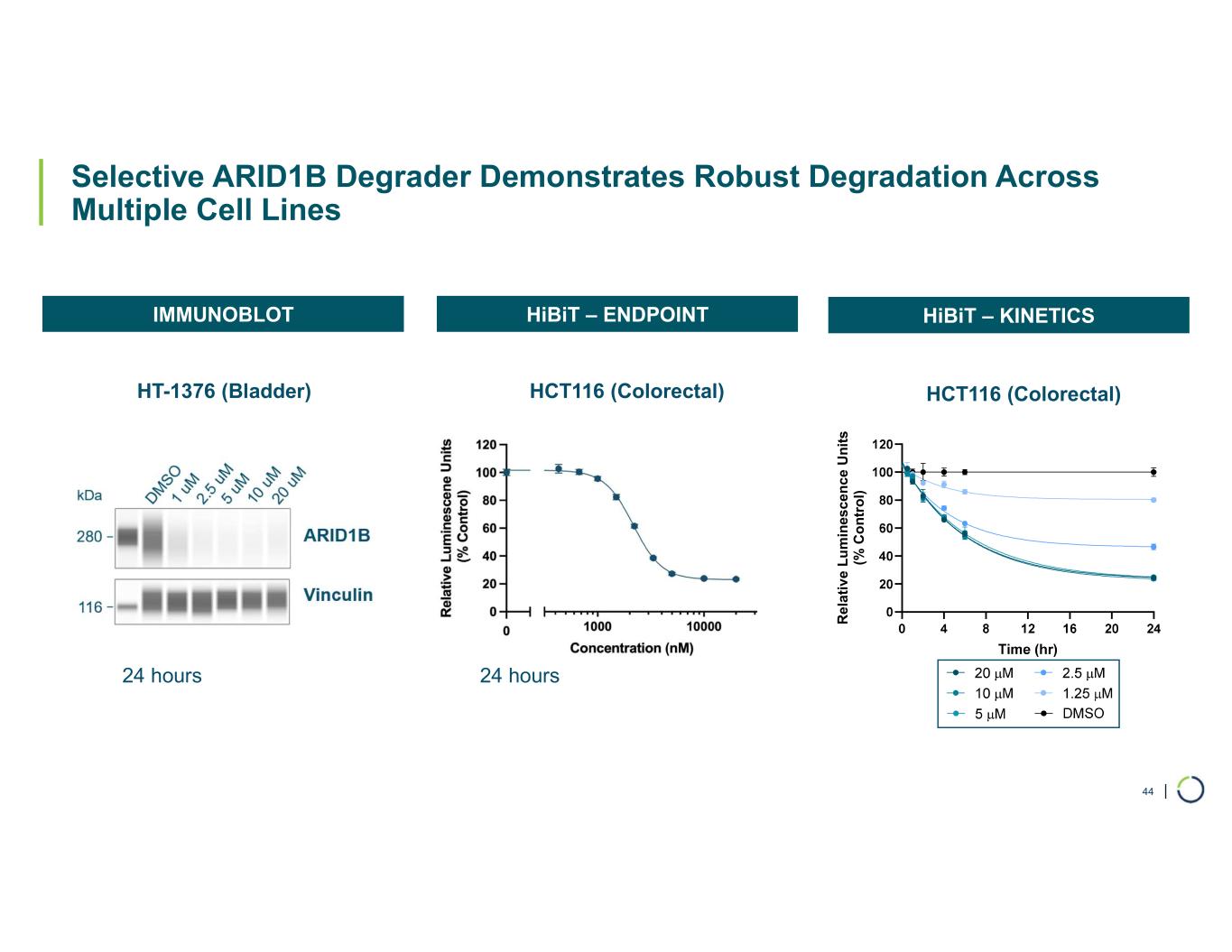 | Selective ARID1B Degrader Demonstrates Robust Degradation Across Multiple Cell Lines 44 IMMUNOBLOT HiBiT – ENDPOINT HCT116 (Colorectal)HT-1376 (Bladder) HiBiT – KINETICS HCT116 (Colorectal) 24 hours 24 hours R e la ti v e L u m in es c e n c e U n it s (% C o n tr o l)