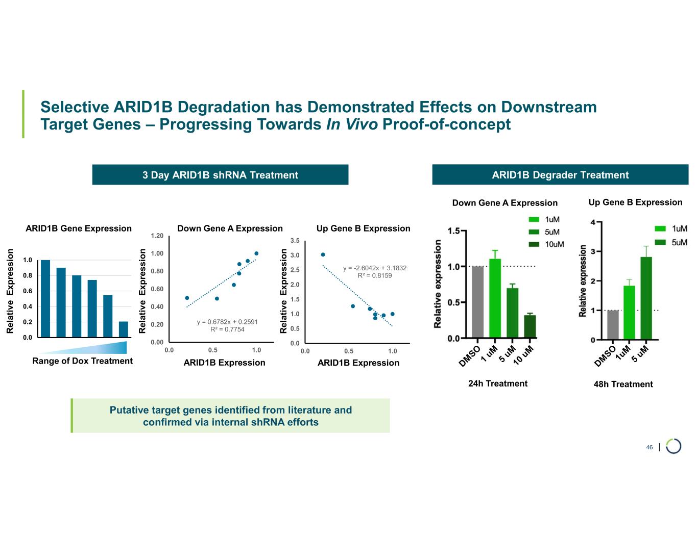 | 0.0 0.2 0.4 0.6 0.8 1.0 1 2 3 4 5 6 Selective ARID1B Degradation has Demonstrated Effects on Downstream Target Genes – Progressing Towards In Vivo Proof-of-concept 46 3 Day ARID1B shRNA Treatment ARID1B Degrader Treatment y = 0.6782x + 0.2591 R² = 0.7754 0.00 0.20 0.40 0.60 0.80 1.00 1.20 0.0 0.5 1.0 ARID1B expression y = -2.6042x + 3.1832 R² = 0.8159 0.0 0.5 1.0 1.5 2.0 2.5 3.0 3.5 0.0 0.5 1.0 ARID1B expression ARID1B Gene Expression ARID1B Expression ARID1B ExpressionRange of Dox Treatment R e la ti v e E x p re s si o n R e la ti v e E x p re s si o n R e la ti v e E x p re s si o n Down Gene A Expression Up Gene B Expression 24h Treatment 48h Treatment Down Gene A Expression Up Gene B Expression Putative target genes identified from literature and confirmed via internal shRNA efforts