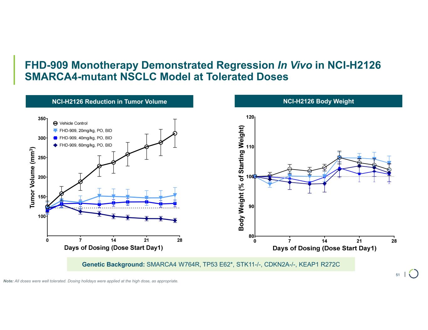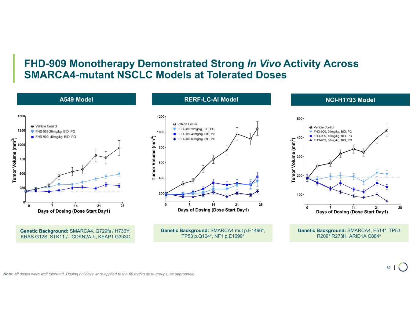| FHD-909 Monotherapy Demonstrated Regression In Vivo in NCI-H2126 SMARCA4-mutant NSCLC Model at Tolerated Doses 51 NCI-H2126 Reduction in Tumor Volume NCI-H2126 Body Weight Genetic Background: SMARCA4 W764R, TP53 E62*, STK11-/-, CDKN2A-/-, KEAP1 R272C Note: All doses were well tolerated. Dosing holidays were applied at the high dose, as appropriate. T u m o r v o lu m e (m m 3 ) Tu m o r V o lu m e (m m 3 )