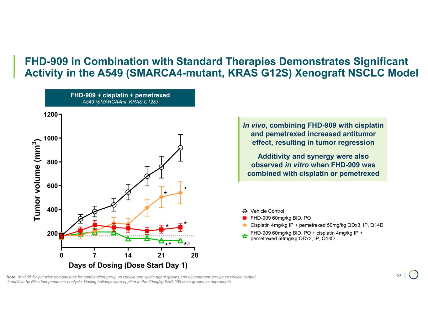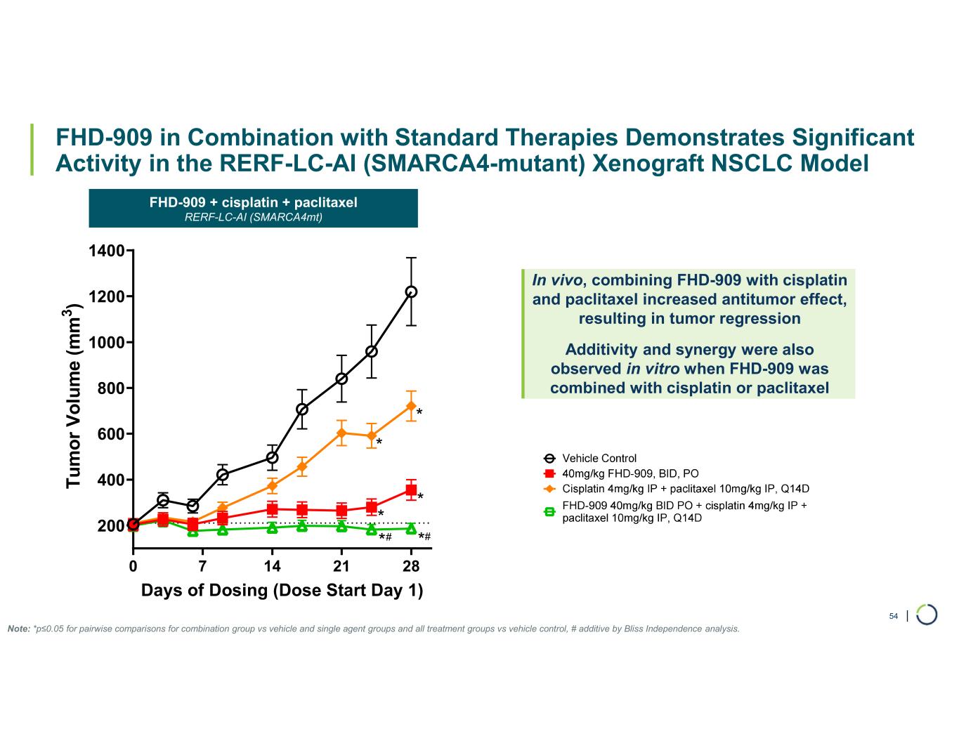 | FHD-909 in Combination with Standard Therapies Demonstrates Significant Activity in the A549 (SMARCA4-mutant, KRAS G12S) Xenograft NSCLC Model 53 0 7 14 21 28 200 400 600 800 1000 1200 Days of Dosing (Dose Start Day 1) T u m o r vo lu m e (m m 3 ) * * * * ** ## Note: *p≤0.05 for pairwise comparisons for combination group vs vehicle and single agent groups and all treatment groups vs vehicle control, # additive by Bliss Independence analysis. Dosing holidays were applied to the 60mg/kg FHD-909 dose groups as appropriate. FHD-909 + cisplatin + pemetrexed A549 (SMARCA4mt, KRAS G12S) In vivo, combining FHD-909 with cisplatin and pemetrexed increased antitumor effect, resulting in tumor regression Additivity and synergy were also observed in vitro when FHD-909 was combined with cisplatin or pemetrexed