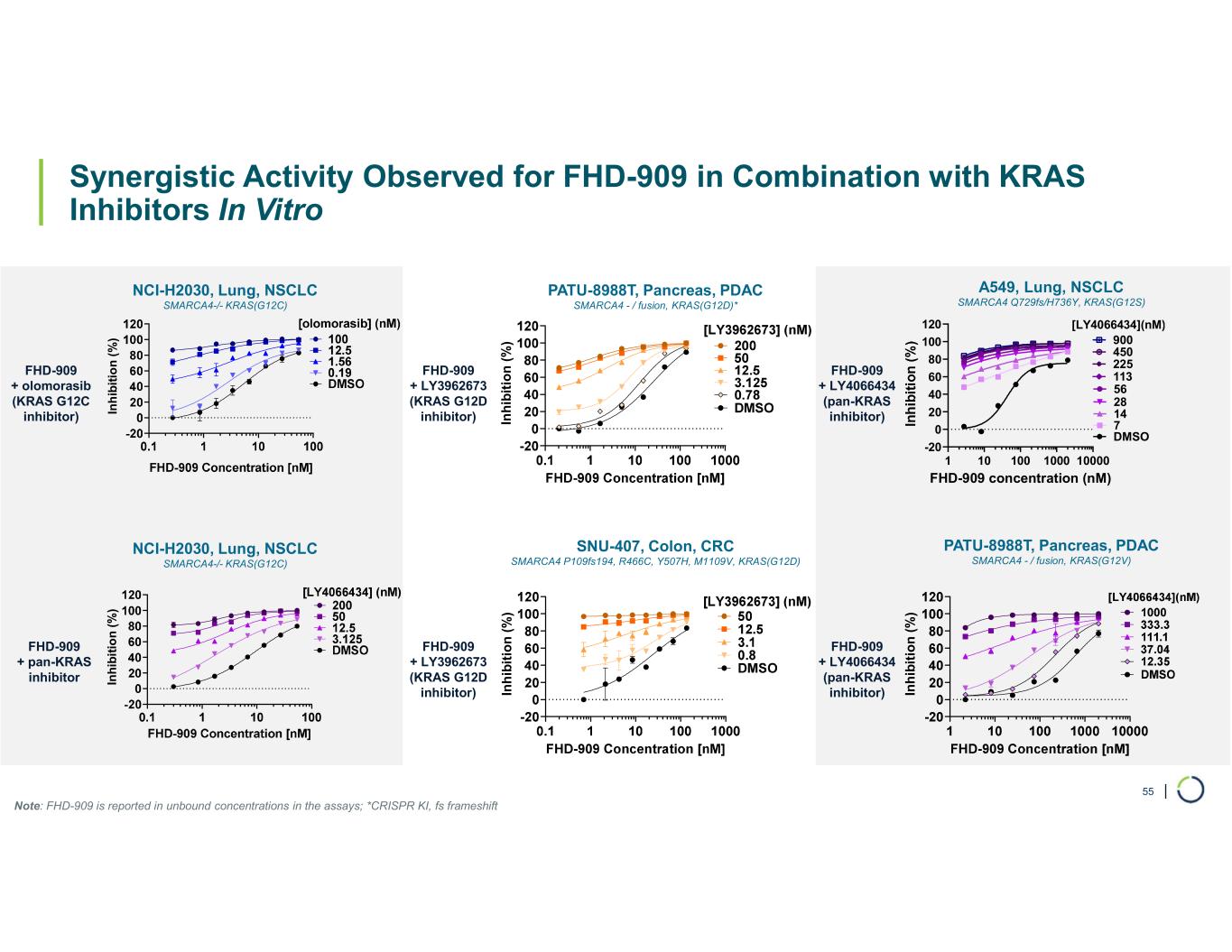 | Synergistic Activity Observed for FHD-909 in Combination with KRAS Inhibitors In Vitro 55 In h ib it io n ( % ) In h ib it io n ( % ) FHD-909 + olomorasib (KRAS G12C inhibitor) FHD-909 + pan-KRAS inhibitor In h ib it io n ( % ) In h ib it io n ( % ) 1 10 100 1000 10000 -20 0 20 40 60 80 100 120 FHD-909 concentration (nM) DMSO 7 14 28 56 113 225 450 900 [LY4066434](nM) In h ib it io n ( % ) NCI-H2030, Lung, NSCLC SMARCA4-/- KRAS(G12C) PATU-8988T, Pancreas, PDAC SMARCA4 - / fusion, KRAS(G12D)* SNU-407, Colon, CRC SMARCA4 P109fs194, R466C, Y507H, M1109V, KRAS(G12D) A549, Lung, NSCLC SMARCA4 Q729fs/H736Y, KRAS(G12S) PATU-8988T, Pancreas, PDAC SMARCA4 - / fusion, KRAS(G12V) Note: FHD-909 is reported in unbound concentrations in the assays; *CRISPR KI, fs frameshift FHD-909 + LY3962673 (KRAS G12D inhibitor) FHD-909 + LY4066434 (pan-KRAS inhibitor) FHD-909 + LY3962673 (KRAS G12D inhibitor) FHD-909 + LY4066434 (pan-KRAS inhibitor) NCI-H2030, Lung, NSCLC SMARCA4-/- KRAS(G12C)