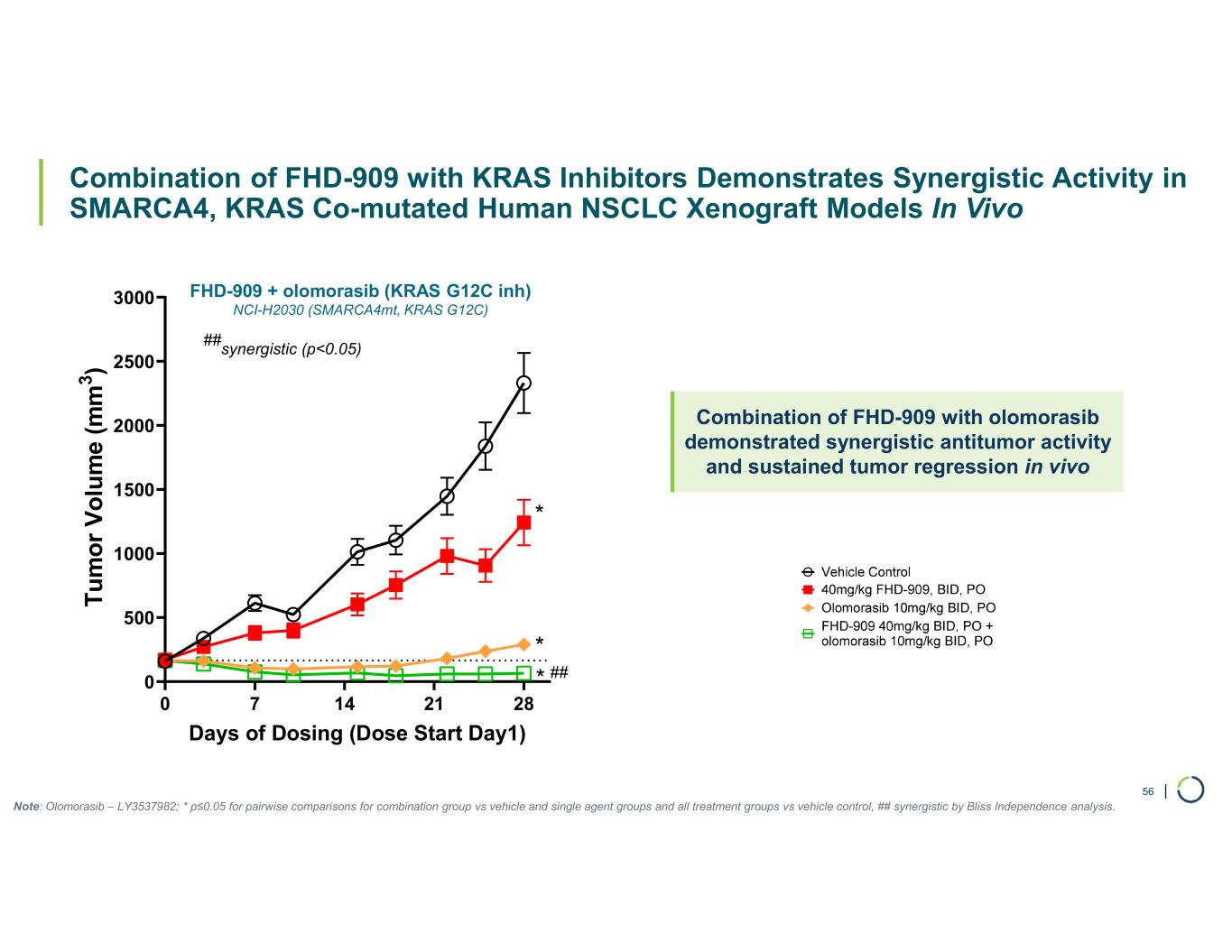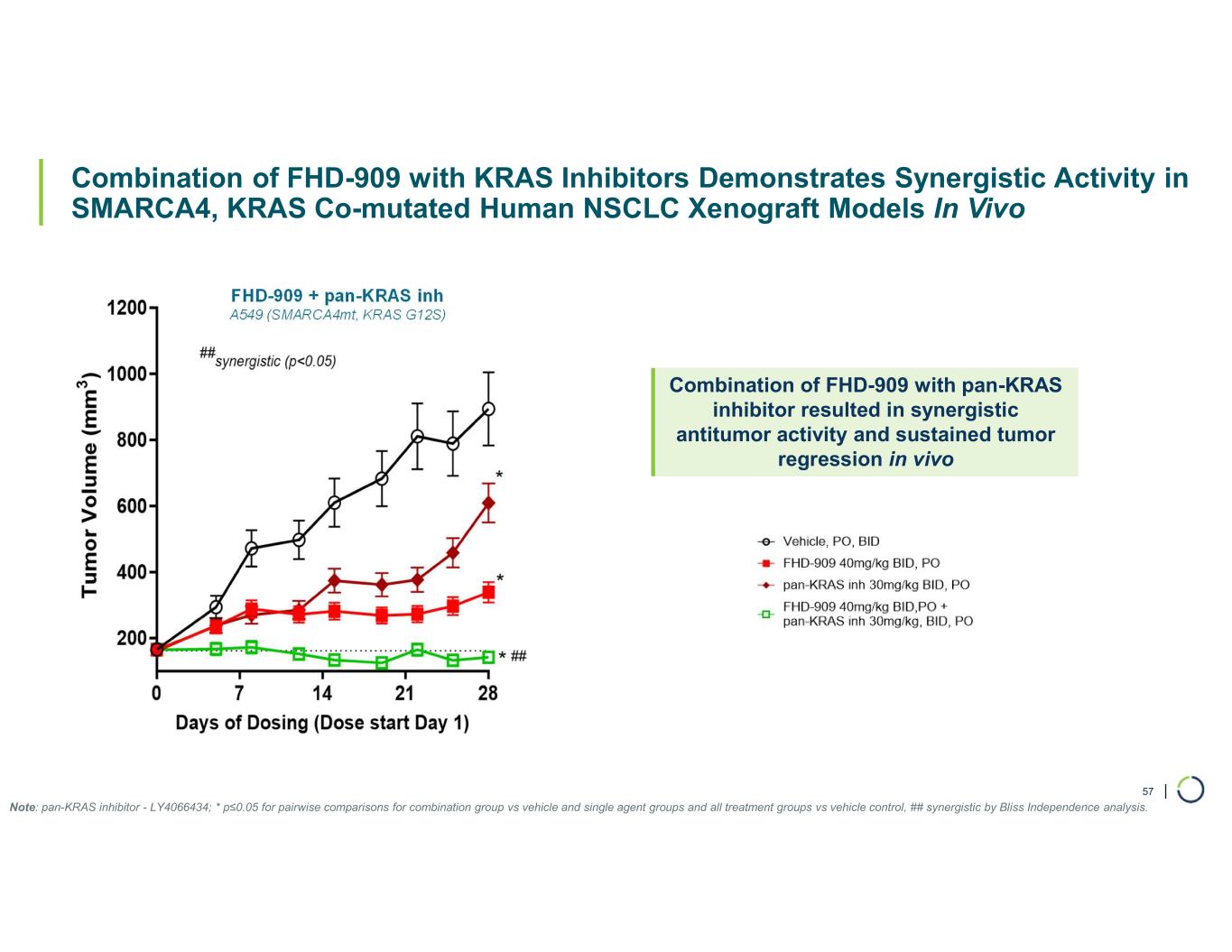 | Combination of FHD-909 with KRAS Inhibitors Demonstrates Synergistic Activity in SMARCA4, KRAS Co-mutated Human NSCLC Xenograft Models In Vivo FHD-909 + olomorasib (KRAS G12C inh) NCI-H2030 (SMARCA4mt, KRAS G12C) 56 0 7 14 21 28 0 500 1000 1500 2000 2500 3000 Days of Dosing (Dose Start Day1) T u m o r V o lu m e (m m 3 ) ## synergistic (p<0.05) * * * ## Combination of FHD-909 with olomorasib demonstrated synergistic antitumor activity and sustained tumor regression in vivo Note: Olomorasib – LY3537982; * p≤0.05 for pairwise comparisons for combination group vs vehicle and single agent groups and all treatment groups vs vehicle control, ## synergistic by Bliss Independence analysis.