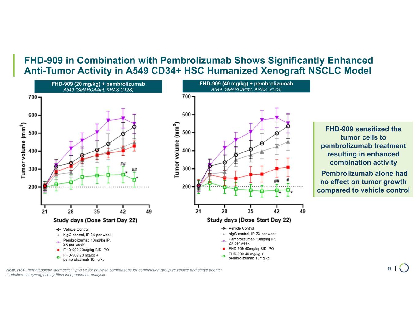 | FHD-909 in Combination with Pembrolizumab Shows Significantly Enhanced Anti-Tumor Activity in A549 CD34+ HSC Humanized Xenograft NSCLC Model 58 FHD-909 sensitized the tumor cells to pembrolizumab treatment resulting in enhanced combination activity Pembrolizumab alone had no effect on tumor growth compared to vehicle control Note: HSC, hematopoietic stem cells; * p≤0.05 for pairwise comparisons for combination group vs vehicle and single agents; # additive, ## synergistic by Bliss Independence analysis. FHD-909 (20 mg/kg) + pembrolizumab A549 (SMARCA4mt, KRAS G12S) FHD-909 (40 mg/kg) + pembrolizumab A549 (SMARCA4mt, KRAS G12S)