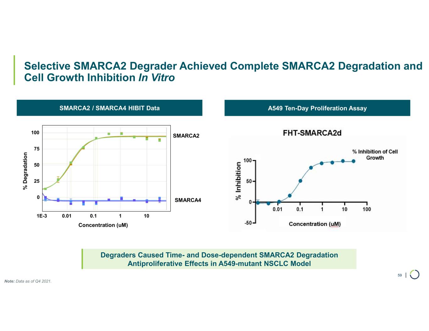 | Selective SMARCA2 Degrader Achieved Complete SMARCA2 Degradation and Cell Growth Inhibition In Vitro 59 Degraders Caused Time- and Dose-dependent SMARCA2 Degradation Antiproliferative Effects in A549-mutant NSCLC Model A549 Ten-Day Proliferation AssaySMARCA2 / SMARCA4 HIBIT Data SMARCA2 SMARCA4 % D eg ra d a ti o n Concentration (uM) 0 25 50 75 100 1E-3 0.01 0.1 1 10 Note: Data as of Q4 2021.