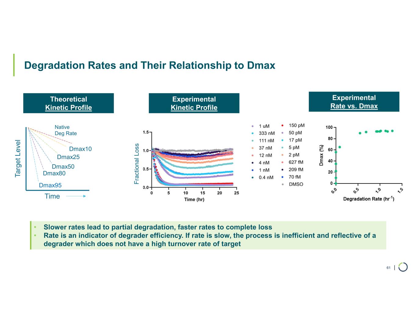 | Degradation Rates and Their Relationship to Dmax 61 • Slower rates lead to partial degradation, faster rates to complete loss • Rate is an indicator of degrader efficiency. If rate is slow, the process is inefficient and reflective of a degrader which does not have a high turnover rate of target Native Deg Rate Ta rg e t L ev e l Time Dmax10 Dmax25 Dmax50 Dmax80 Dmax95 Experimental Rate vs. Dmax Experimental Kinetic Profile Theoretical Kinetic Profile F ra ct io na l L os s