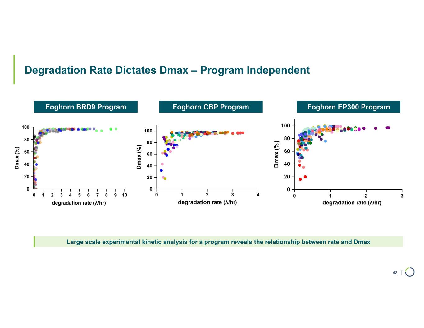 | Degradation Rate Dictates Dmax – Program Independent 62 Foghorn CBP ProgramFoghorn BRD9 Program Foghorn EP300 Program Large scale experimental kinetic analysis for a program reveals the relationship between rate and Dmax