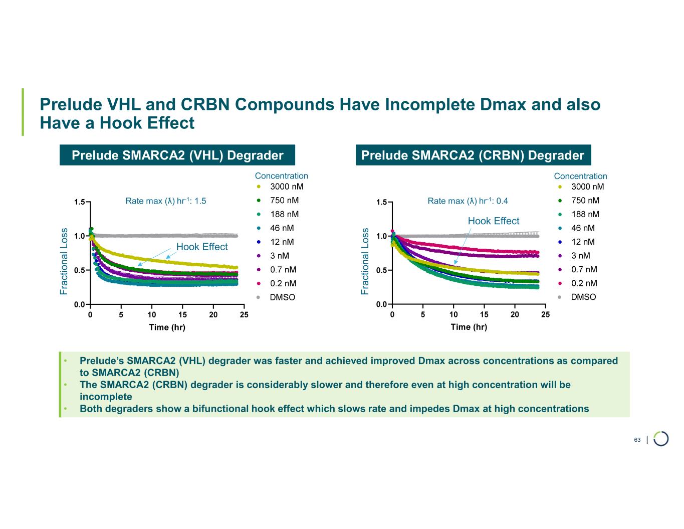 | Prelude VHL and CRBN Compounds Have Incomplete Dmax and also Have a Hook Effect 63 • Prelude’s SMARCA2 (VHL) degrader was faster and achieved improved Dmax across concentrations as compared to SMARCA2 (CRBN) • The SMARCA2 (CRBN) degrader is considerably slower and therefore even at high concentration will be incomplete • Both degraders show a bifunctional hook effect which slows rate and impedes Dmax at high concentrations Prelude SMARCA2 (CRBN) DegraderPrelude SMARCA2 (VHL) Degrader F ra c ti o n a l L u m in e s c e n c e (R L U ) Concentration F ra ct io n a l L u m in es ce n ce (R L U ) Concentration Hook Effect Hook Effect Rate max (ƛ) hr-1: 0.4Rate max (ƛ) hr-1: 1.5 F ra ct io na l L os s F ra ct io na l L os s