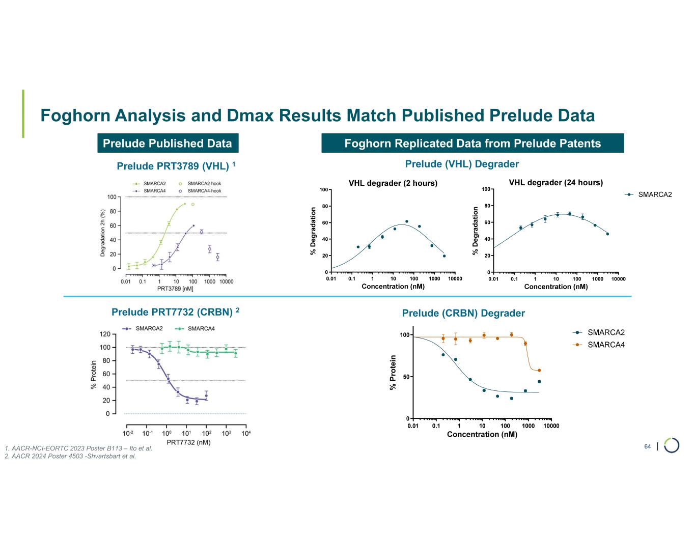 | Foghorn Analysis and Dmax Results Match Published Prelude Data 64 Prelude Published Data Prelude PRT3789 (VHL) 1 Prelude PRT7732 (CRBN) 2 % P ro te in Prelude (CRBN) Degrader Prelude (VHL) Degrader Foghorn Replicated Data from Prelude Patents 1. AACR-NCI-EORTC 2023 Poster B113 – Ito et al. 2. AACR 2024 Poster 4503 -Shvartsbart et al. % D eg ra d at io n % D e g ra d a ti o n