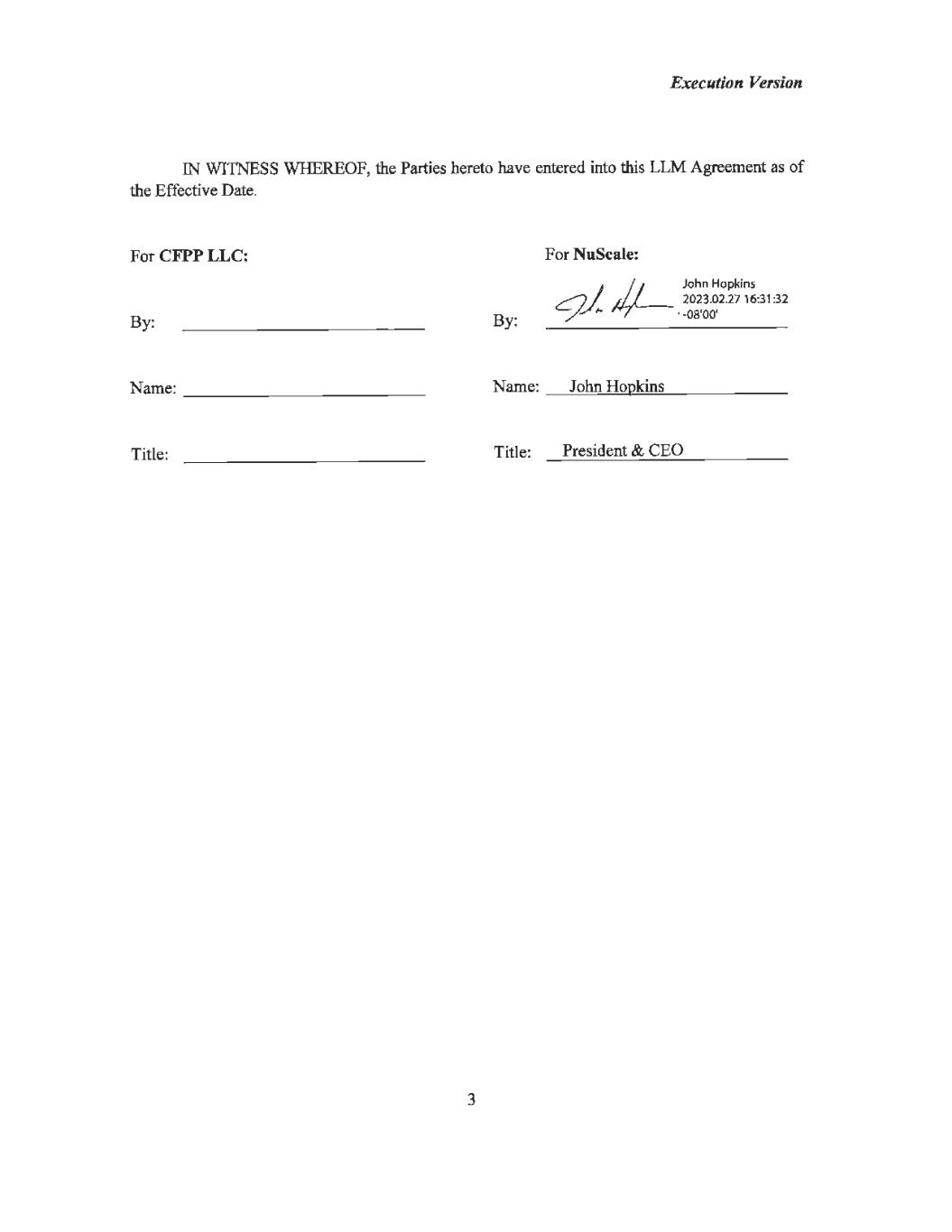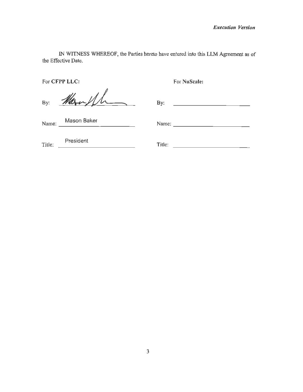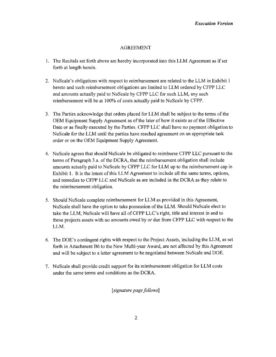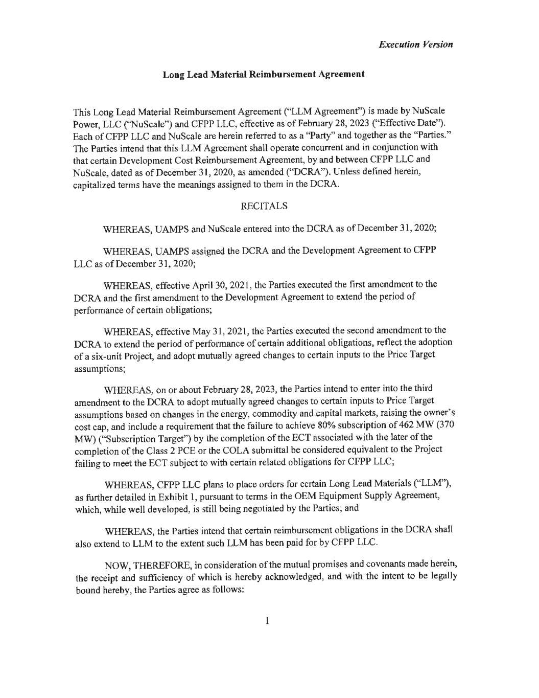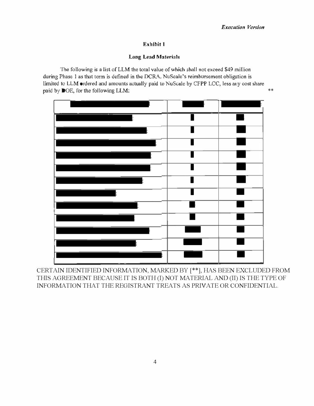 Execution Version Exhibit 1 Long Lead Materials The following is a list of LLM the total value of which shall not exceed $49 million during Phase 1 as that term is defined in the DCRA. NuScale's reimbursement obligation is limited to LLM ordered and amounts actually paid to NuScale by Cf PP LCC, less any cost share paid by DOE, for the following LLM: I ■ I I I I I I ■ ■ ■ ■ - ■ - ■ - ■ 4 ** CERTAIN IDENTIFIED INFORMATION, MARKED BY [**], HAS BEEN EXCLUDED FROM THIS AGREEMENT BECAUSE IT IS BOTH (I) NOT MATERIAL AND (II) IS THE TYPE OF INFORMATION THAT THE REGISTRANT TREATS AS PRIVATE OR CONFIDENTIAL.
