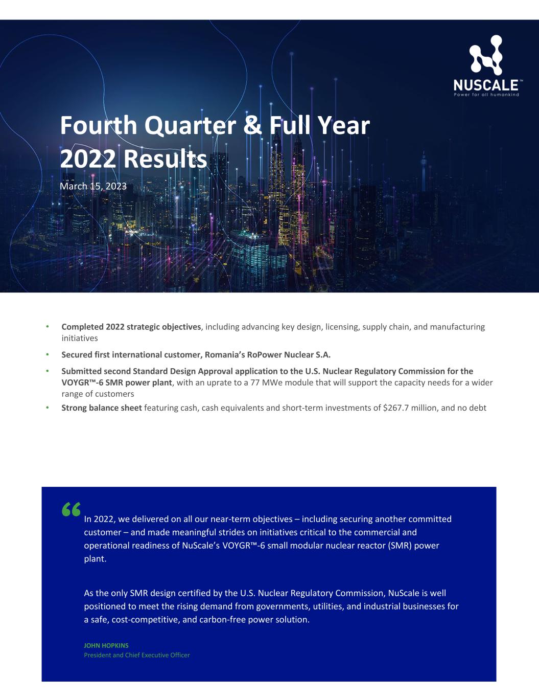 • • Fourth Quarter & Full Year 2022 Results March 15, 2023 • Completed 2022 strategic objectives, including advancing key design, licensing, supply chain, and manufacturing initiatives • Secured first international customer, Romania’s RoPower Nuclear S.A. • Submitted second Standard Design Approval application to the U.S. Nuclear Regulatory Commission for the VOYGR™-6 SMR power plant, with an uprate to a 77 MWe module that will support the capacity needs for a wider range of customers • Strong balance sheet featuring cash, cash equivalents and short-term investments of $267.7 million, and no debt In 2022, we delivered on all our near-term objectives – including securing another committed customer – and made meaningful strides on initiatives critical to the commercial and operational readiness of NuScale’s VOYGR™-6 small modular nuclear reactor (SMR) power plant. As the only SMR design certified by the U.S. Nuclear Regulatory Commission, NuScale is well positioned to meet the rising demand from governments, utilities, and industrial businesses for a safe, cost-competitive, and carbon-free power solution. JOHN HOPKINS President and Chief Executive Officer