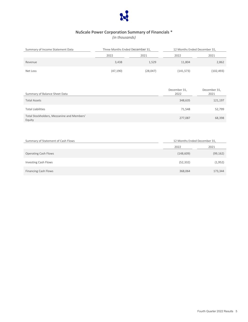 Fourth Quarter 2022 Results 3 ABOUT NUSCALE POWER CORPORATION NuScale Power Corporation (NYSE: SMR) is the industry-leading provider of proprietary and innovative advanced small modular reactor nuclear technology, with a mission to help power the global energy transition by delivering safe, scalable, and reliable carbon-free energy. The company’s groundbreaking VOYGR™ SMR plants are powered by the NuScale Power Module™, a small, safe, pressurized water reactor that can each generate 77 megawatts of electricity (MWe) or 250 megawatts thermal (gross), and can be scaled to meet customer needs through an array of flexible configurations up to 924 MWe (12 modules) of output. As the first and only SMR to have its design certified by the U.S. Nuclear Regulatory Commission, NuScale is well- positioned to serve diverse customers across the world by supplying nuclear energy for electrical generation, district heating, desalination, commercial-scale hydrogen production, and other process heat applications. Founded in 2007, NuScale is headquartered in Portland, Ore. To learn more, visit NuScale Power’s website or follow us on Twitter, Facebook, LinkedIn, Instagram and YouTube. CONTACTS Investor and Media Contacts Investor inquiries: Scott Kozak, NuScale Power skozak@nuscalepower.com Media inquiries: Diane Hughes, NuScale Power media@nuscalepower.com
