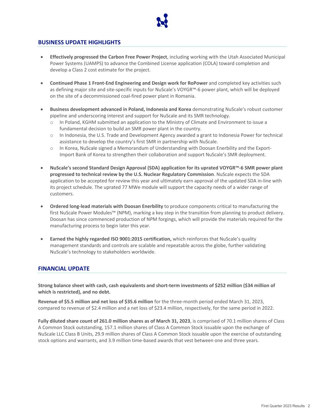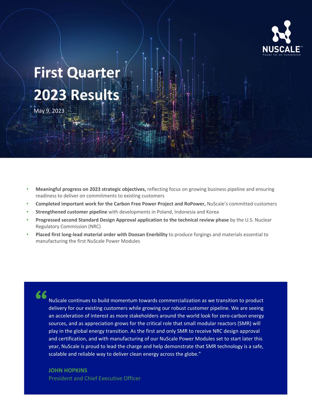 Temple reviewed • • First Quarter 2023 Results May 9, 2023 • Meaningful progress on 2023 strategic objectives, reflecting focus on growing business pipeline and ensuring readiness to deliver on commitments to existing customers • Completed important work for the Carbon Free Power Project and RoPower, NuScale’s committed customers • Strengthened customer pipeline with developments in Poland, Indonesia and Korea • Progressed second Standard Design Approval application to the technical review phase by the U.S. Nuclear Regulatory Commission (NRC) • Placed first long-lead material order with Doosan Enerbility to produce forgings and materials essential to manufacturing the first NuScale Power Modules NuScale continues to build momentum towards commercialization as we transition to product delivery for our existing customers while growing our robust customer pipeline. We are seeing an acceleration of interest as more stakeholders around the world look for zero-carbon energy sources, and as appreciation grows for the critical role that small modular reactors (SMR) will play in the global energy transition. As the first and only SMR to receive NRC design approval and certification, and with manufacturing of our NuScale Power Modules set to start later this year, NuScale is proud to lead the charge and help demonstrate that SMR technology is a safe, scalable and reliable way to deliver clean energy across the globe.” JOHN HOPKINS President and Chief Executive Officer