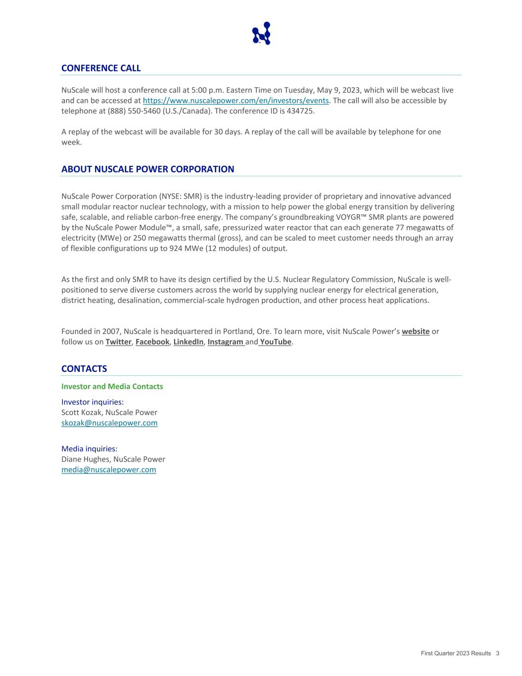 First Quarter 2023 Results 3 CONFERENCE CALL NuScale will host a conference call at 5:00 p.m. Eastern Time on Tuesday, May 9, 2023, which will be webcast live and can be accessed at https://www.nuscalepower.com/en/investors/events. The call will also be accessible by telephone at (888) 550-5460 (U.S./Canada). The conference ID is 434725. A replay of the webcast will be available for 30 days. A replay of the call will be available by telephone for one week. ABOUT NUSCALE POWER CORPORATION NuScale Power Corporation (NYSE: SMR) is the industry-leading provider of proprietary and innovative advanced small modular reactor nuclear technology, with a mission to help power the global energy transition by delivering safe, scalable, and reliable carbon-free energy. The company’s groundbreaking VOYGR™ SMR plants are powered by the NuScale Power Module™, a small, safe, pressurized water reactor that can each generate 77 megawatts of electricity (MWe) or 250 megawatts thermal (gross), and can be scaled to meet customer needs through an array of flexible configurations up to 924 MWe (12 modules) of output. As the first and only SMR to have its design certified by the U.S. Nuclear Regulatory Commission, NuScale is well- positioned to serve diverse customers across the world by supplying nuclear energy for electrical generation, district heating, desalination, commercial-scale hydrogen production, and other process heat applications. Founded in 2007, NuScale is headquartered in Portland, Ore. To learn more, visit NuScale Power’s website or follow us on Twitter, Facebook, LinkedIn, Instagram and YouTube. CONTACTS Investor and Media Contacts Investor inquiries: Scott Kozak, NuScale Power skozak@nuscalepower.com Media inquiries: Diane Hughes, NuScale Power media@nuscalepower.com