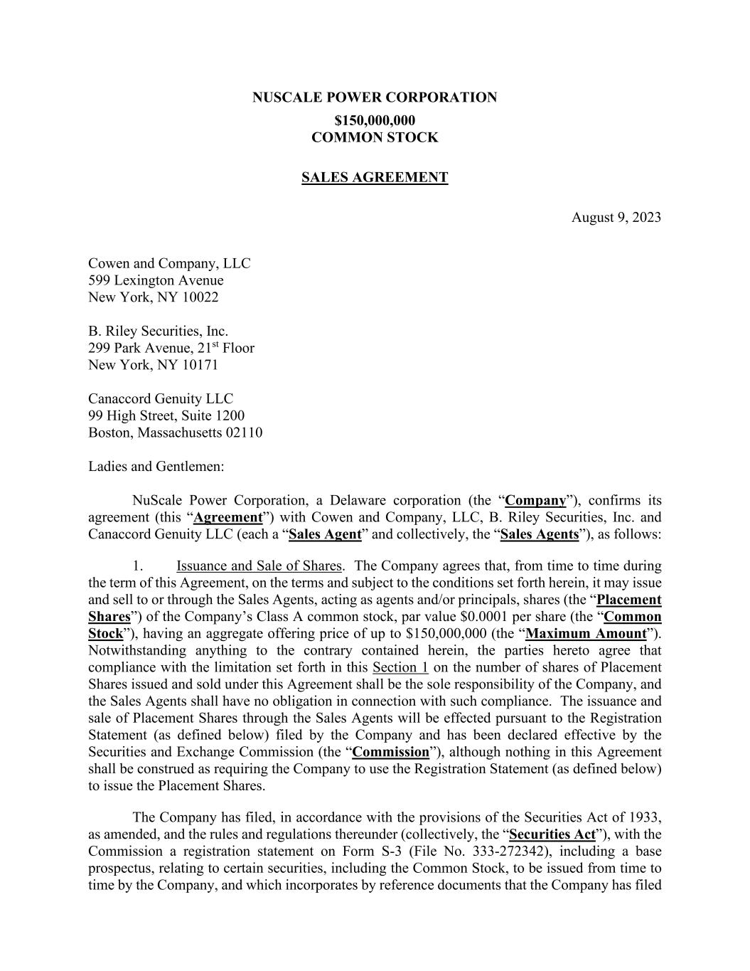 NUSCALE POWER CORPORATION $150,000,000 COMMON STOCK SALES AGREEMENT August 9, 2023 Cowen and Company, LLC 599 Lexington Avenue New York, NY 10022 B. Riley Securities, Inc. 299 Park Avenue, 21st Floor New York, NY 10171 Canaccord Genuity LLC 99 High Street, Suite 1200 Boston, Massachusetts 02110 Ladies and Gentlemen: NuScale Power Corporation, a Delaware corporation (the “Company”), confirms its agreement (this “Agreement”) with Cowen and Company, LLC, B. Riley Securities, Inc. and Canaccord Genuity LLC (each a “Sales Agent” and collectively, the “Sales Agents”), as follows: 1. Issuance and Sale of Shares. The Company agrees that, from time to time during the term of this Agreement, on the terms and subject to the conditions set forth herein, it may issue and sell to or through the Sales Agents, acting as agents and/or principals, shares (the “Placement Shares”) of the Company’s Class A common stock, par value $0.0001 per share (the “Common Stock”), having an aggregate offering price of up to $150,000,000 (the “Maximum Amount”). Notwithstanding anything to the contrary contained herein, the parties hereto agree that compliance with the limitation set forth in this Section 1 on the number of shares of Placement Shares issued and sold under this Agreement shall be the sole responsibility of the Company, and the Sales Agents shall have no obligation in connection with such compliance. The issuance and sale of Placement Shares through the Sales Agents will be effected pursuant to the Registration Statement (as defined below) filed by the Company and has been declared effective by the Securities and Exchange Commission (the “Commission”), although nothing in this Agreement shall be construed as requiring the Company to use the Registration Statement (as defined below) to issue the Placement Shares. The Company has filed, in accordance with the provisions of the Securities Act of 1933, as amended, and the rules and regulations thereunder (collectively, the “Securities Act”), with the Commission a registration statement on Form S-3 (File No. 333-272342), including a base prospectus, relating to certain securities, including the Common Stock, to be issued from time to time by the Company, and which incorporates by reference documents that the Company has filed