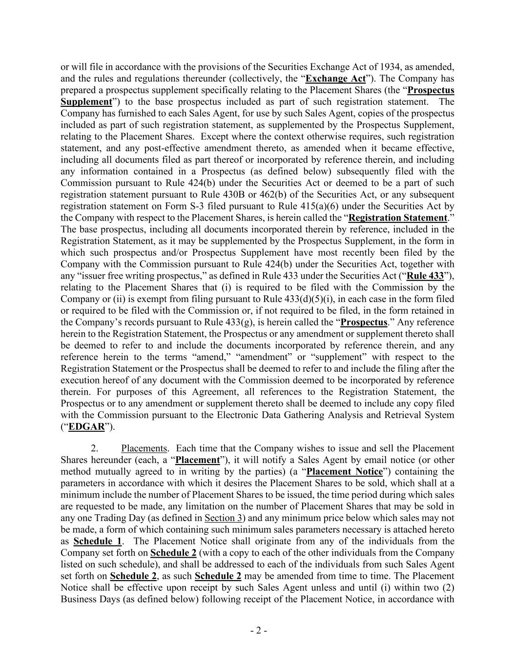 - 2 - or will file in accordance with the provisions of the Securities Exchange Act of 1934, as amended, and the rules and regulations thereunder (collectively, the “Exchange Act”). The Company has prepared a prospectus supplement specifically relating to the Placement Shares (the “Prospectus Supplement”) to the base prospectus included as part of such registration statement. The Company has furnished to each Sales Agent, for use by such Sales Agent, copies of the prospectus included as part of such registration statement, as supplemented by the Prospectus Supplement, relating to the Placement Shares. Except where the context otherwise requires, such registration statement, and any post-effective amendment thereto, as amended when it became effective, including all documents filed as part thereof or incorporated by reference therein, and including any information contained in a Prospectus (as defined below) subsequently filed with the Commission pursuant to Rule 424(b) under the Securities Act or deemed to be a part of such registration statement pursuant to Rule 430B or 462(b) of the Securities Act, or any subsequent registration statement on Form S-3 filed pursuant to Rule 415(a)(6) under the Securities Act by the Company with respect to the Placement Shares, is herein called the “Registration Statement.” The base prospectus, including all documents incorporated therein by reference, included in the Registration Statement, as it may be supplemented by the Prospectus Supplement, in the form in which such prospectus and/or Prospectus Supplement have most recently been filed by the Company with the Commission pursuant to Rule 424(b) under the Securities Act, together with any “issuer free writing prospectus,” as defined in Rule 433 under the Securities Act (“Rule 433”), relating to the Placement Shares that (i) is required to be filed with the Commission by the Company or (ii) is exempt from filing pursuant to Rule 433(d)(5)(i), in each case in the form filed or required to be filed with the Commission or, if not required to be filed, in the form retained in the Company’s records pursuant to Rule 433(g), is herein called the “Prospectus.” Any reference herein to the Registration Statement, the Prospectus or any amendment or supplement thereto shall be deemed to refer to and include the documents incorporated by reference therein, and any reference herein to the terms “amend,” “amendment” or “supplement” with respect to the Registration Statement or the Prospectus shall be deemed to refer to and include the filing after the execution hereof of any document with the Commission deemed to be incorporated by reference therein. For purposes of this Agreement, all references to the Registration Statement, the Prospectus or to any amendment or supplement thereto shall be deemed to include any copy filed with the Commission pursuant to the Electronic Data Gathering Analysis and Retrieval System (“EDGAR”). 2. Placements. Each time that the Company wishes to issue and sell the Placement Shares hereunder (each, a “Placement”), it will notify a Sales Agent by email notice (or other method mutually agreed to in writing by the parties) (a “Placement Notice”) containing the parameters in accordance with which it desires the Placement Shares to be sold, which shall at a minimum include the number of Placement Shares to be issued, the time period during which sales are requested to be made, any limitation on the number of Placement Shares that may be sold in any one Trading Day (as defined in Section 3) and any minimum price below which sales may not be made, a form of which containing such minimum sales parameters necessary is attached hereto as Schedule 1. The Placement Notice shall originate from any of the individuals from the Company set forth on Schedule 2 (with a copy to each of the other individuals from the Company listed on such schedule), and shall be addressed to each of the individuals from such Sales Agent set forth on Schedule 2, as such Schedule 2 may be amended from time to time. The Placement Notice shall be effective upon receipt by such Sales Agent unless and until (i) within two (2) Business Days (as defined below) following receipt of the Placement Notice, in accordance with