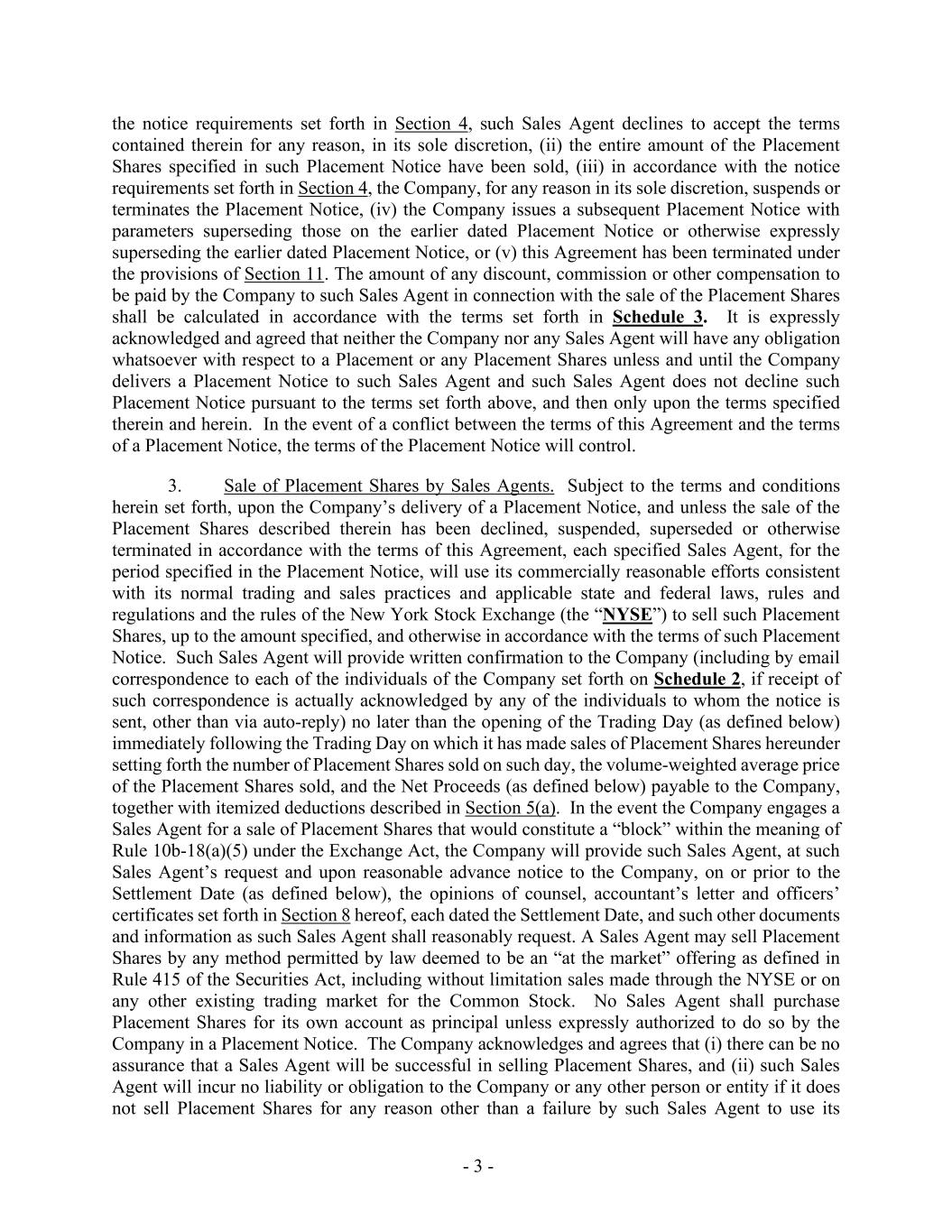 - 3 - the notice requirements set forth in Section 4, such Sales Agent declines to accept the terms contained therein for any reason, in its sole discretion, (ii) the entire amount of the Placement Shares specified in such Placement Notice have been sold, (iii) in accordance with the notice requirements set forth in Section 4, the Company, for any reason in its sole discretion, suspends or terminates the Placement Notice, (iv) the Company issues a subsequent Placement Notice with parameters superseding those on the earlier dated Placement Notice or otherwise expressly superseding the earlier dated Placement Notice, or (v) this Agreement has been terminated under the provisions of Section 11. The amount of any discount, commission or other compensation to be paid by the Company to such Sales Agent in connection with the sale of the Placement Shares shall be calculated in accordance with the terms set forth in Schedule 3. It is expressly acknowledged and agreed that neither the Company nor any Sales Agent will have any obligation whatsoever with respect to a Placement or any Placement Shares unless and until the Company delivers a Placement Notice to such Sales Agent and such Sales Agent does not decline such Placement Notice pursuant to the terms set forth above, and then only upon the terms specified therein and herein. In the event of a conflict between the terms of this Agreement and the terms of a Placement Notice, the terms of the Placement Notice will control. 3. Sale of Placement Shares by Sales Agents. Subject to the terms and conditions herein set forth, upon the Company’s delivery of a Placement Notice, and unless the sale of the Placement Shares described therein has been declined, suspended, superseded or otherwise terminated in accordance with the terms of this Agreement, each specified Sales Agent, for the period specified in the Placement Notice, will use its commercially reasonable efforts consistent with its normal trading and sales practices and applicable state and federal laws, rules and regulations and the rules of the New York Stock Exchange (the “NYSE”) to sell such Placement Shares, up to the amount specified, and otherwise in accordance with the terms of such Placement Notice. Such Sales Agent will provide written confirmation to the Company (including by email correspondence to each of the individuals of the Company set forth on Schedule 2, if receipt of such correspondence is actually acknowledged by any of the individuals to whom the notice is sent, other than via auto-reply) no later than the opening of the Trading Day (as defined below) immediately following the Trading Day on which it has made sales of Placement Shares hereunder setting forth the number of Placement Shares sold on such day, the volume-weighted average price of the Placement Shares sold, and the Net Proceeds (as defined below) payable to the Company, together with itemized deductions described in Section 5(a). In the event the Company engages a Sales Agent for a sale of Placement Shares that would constitute a “block” within the meaning of Rule 10b-18(a)(5) under the Exchange Act, the Company will provide such Sales Agent, at such Sales Agent’s request and upon reasonable advance notice to the Company, on or prior to the Settlement Date (as defined below), the opinions of counsel, accountant’s letter and officers’ certificates set forth in Section 8 hereof, each dated the Settlement Date, and such other documents and information as such Sales Agent shall reasonably request. A Sales Agent may sell Placement Shares by any method permitted by law deemed to be an “at the market” offering as defined in Rule 415 of the Securities Act, including without limitation sales made through the NYSE or on any other existing trading market for the Common Stock. No Sales Agent shall purchase Placement Shares for its own account as principal unless expressly authorized to do so by the Company in a Placement Notice. The Company acknowledges and agrees that (i) there can be no assurance that a Sales Agent will be successful in selling Placement Shares, and (ii) such Sales Agent will incur no liability or obligation to the Company or any other person or entity if it does not sell Placement Shares for any reason other than a failure by such Sales Agent to use its