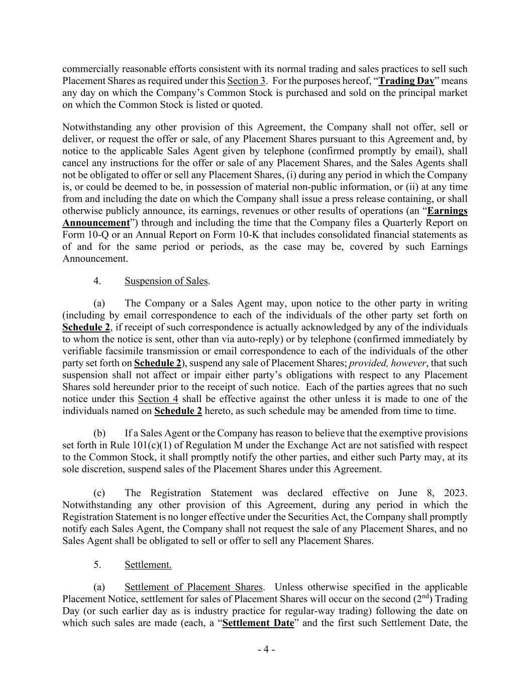 - 4 - commercially reasonable efforts consistent with its normal trading and sales practices to sell such Placement Shares as required under this Section 3. For the purposes hereof, “Trading Day” means any day on which the Company’s Common Stock is purchased and sold on the principal market on which the Common Stock is listed or quoted. Notwithstanding any other provision of this Agreement, the Company shall not offer, sell or deliver, or request the offer or sale, of any Placement Shares pursuant to this Agreement and, by notice to the applicable Sales Agent given by telephone (confirmed promptly by email), shall cancel any instructions for the offer or sale of any Placement Shares, and the Sales Agents shall not be obligated to offer or sell any Placement Shares, (i) during any period in which the Company is, or could be deemed to be, in possession of material non-public information, or (ii) at any time from and including the date on which the Company shall issue a press release containing, or shall otherwise publicly announce, its earnings, revenues or other results of operations (an “Earnings Announcement”) through and including the time that the Company files a Quarterly Report on Form 10-Q or an Annual Report on Form 10-K that includes consolidated financial statements as of and for the same period or periods, as the case may be, covered by such Earnings Announcement. 4. Suspension of Sales. (a) The Company or a Sales Agent may, upon notice to the other party in writing (including by email correspondence to each of the individuals of the other party set forth on Schedule 2, if receipt of such correspondence is actually acknowledged by any of the individuals to whom the notice is sent, other than via auto-reply) or by telephone (confirmed immediately by verifiable facsimile transmission or email correspondence to each of the individuals of the other party set forth on Schedule 2), suspend any sale of Placement Shares; provided, however, that such suspension shall not affect or impair either party’s obligations with respect to any Placement Shares sold hereunder prior to the receipt of such notice. Each of the parties agrees that no such notice under this Section 4 shall be effective against the other unless it is made to one of the individuals named on Schedule 2 hereto, as such schedule may be amended from time to time. (b) If a Sales Agent or the Company has reason to believe that the exemptive provisions set forth in Rule 101(c)(1) of Regulation M under the Exchange Act are not satisfied with respect to the Common Stock, it shall promptly notify the other parties, and either such Party may, at its sole discretion, suspend sales of the Placement Shares under this Agreement. (c) The Registration Statement was declared effective on June 8, 2023. Notwithstanding any other provision of this Agreement, during any period in which the Registration Statement is no longer effective under the Securities Act, the Company shall promptly notify each Sales Agent, the Company shall not request the sale of any Placement Shares, and no Sales Agent shall be obligated to sell or offer to sell any Placement Shares. 5. Settlement. (a) Settlement of Placement Shares. Unless otherwise specified in the applicable Placement Notice, settlement for sales of Placement Shares will occur on the second (2nd) Trading Day (or such earlier day as is industry practice for regular-way trading) following the date on which such sales are made (each, a “Settlement Date” and the first such Settlement Date, the
