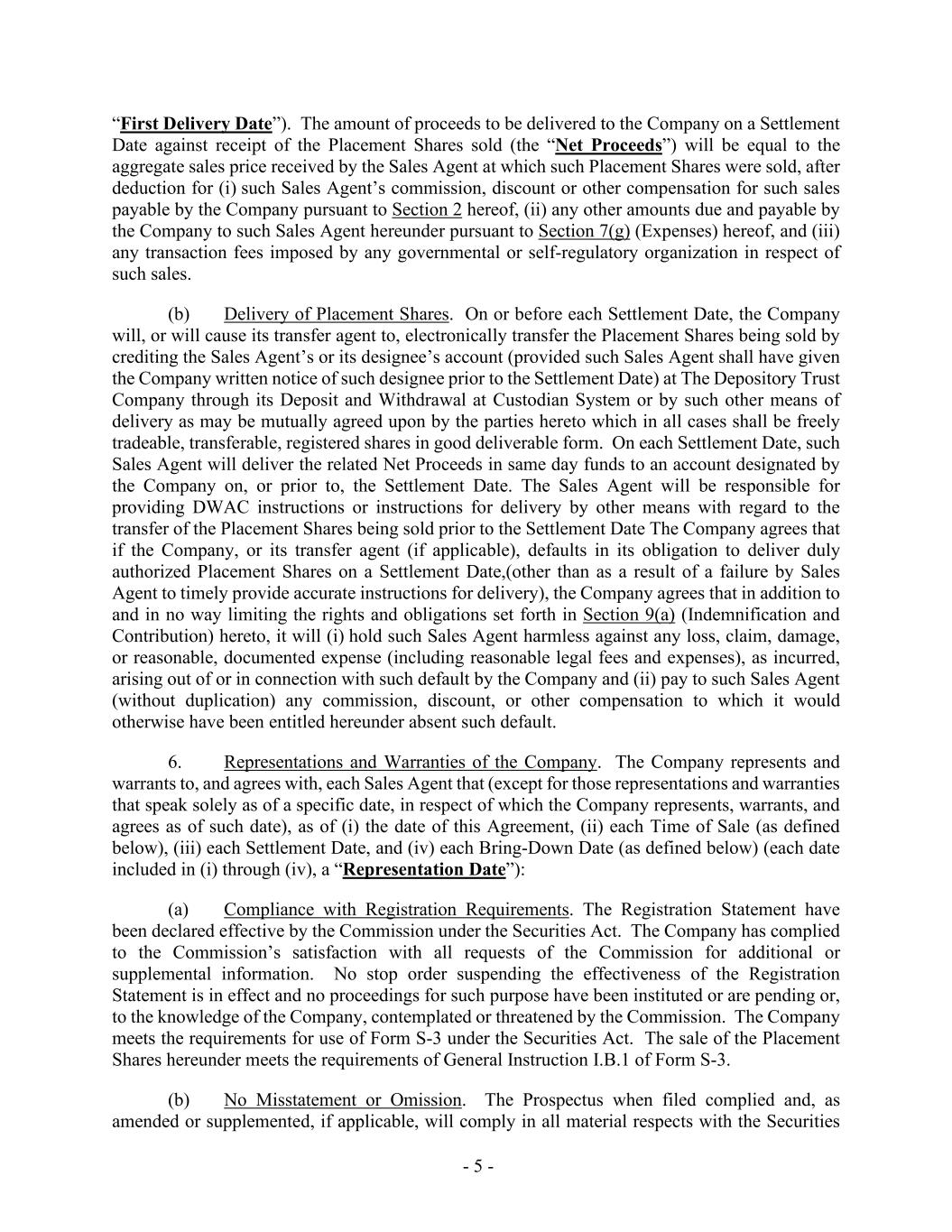 - 5 - “First Delivery Date”). The amount of proceeds to be delivered to the Company on a Settlement Date against receipt of the Placement Shares sold (the “Net Proceeds”) will be equal to the aggregate sales price received by the Sales Agent at which such Placement Shares were sold, after deduction for (i) such Sales Agent’s commission, discount or other compensation for such sales payable by the Company pursuant to Section 2 hereof, (ii) any other amounts due and payable by the Company to such Sales Agent hereunder pursuant to Section 7(g) (Expenses) hereof, and (iii) any transaction fees imposed by any governmental or self-regulatory organization in respect of such sales. (b) Delivery of Placement Shares. On or before each Settlement Date, the Company will, or will cause its transfer agent to, electronically transfer the Placement Shares being sold by crediting the Sales Agent’s or its designee’s account (provided such Sales Agent shall have given the Company written notice of such designee prior to the Settlement Date) at The Depository Trust Company through its Deposit and Withdrawal at Custodian System or by such other means of delivery as may be mutually agreed upon by the parties hereto which in all cases shall be freely tradeable, transferable, registered shares in good deliverable form. On each Settlement Date, such Sales Agent will deliver the related Net Proceeds in same day funds to an account designated by the Company on, or prior to, the Settlement Date. The Sales Agent will be responsible for providing DWAC instructions or instructions for delivery by other means with regard to the transfer of the Placement Shares being sold prior to the Settlement Date The Company agrees that if the Company, or its transfer agent (if applicable), defaults in its obligation to deliver duly authorized Placement Shares on a Settlement Date,(other than as a result of a failure by Sales Agent to timely provide accurate instructions for delivery), the Company agrees that in addition to and in no way limiting the rights and obligations set forth in Section 9(a) (Indemnification and Contribution) hereto, it will (i) hold such Sales Agent harmless against any loss, claim, damage, or reasonable, documented expense (including reasonable legal fees and expenses), as incurred, arising out of or in connection with such default by the Company and (ii) pay to such Sales Agent (without duplication) any commission, discount, or other compensation to which it would otherwise have been entitled hereunder absent such default. 6. Representations and Warranties of the Company. The Company represents and warrants to, and agrees with, each Sales Agent that (except for those representations and warranties that speak solely as of a specific date, in respect of which the Company represents, warrants, and agrees as of such date), as of (i) the date of this Agreement, (ii) each Time of Sale (as defined below), (iii) each Settlement Date, and (iv) each Bring-Down Date (as defined below) (each date included in (i) through (iv), a “Representation Date”): (a) Compliance with Registration Requirements. The Registration Statement have been declared effective by the Commission under the Securities Act. The Company has complied to the Commission’s satisfaction with all requests of the Commission for additional or supplemental information. No stop order suspending the effectiveness of the Registration Statement is in effect and no proceedings for such purpose have been instituted or are pending or, to the knowledge of the Company, contemplated or threatened by the Commission. The Company meets the requirements for use of Form S-3 under the Securities Act. The sale of the Placement Shares hereunder meets the requirements of General Instruction I.B.1 of Form S-3. (b) No Misstatement or Omission. The Prospectus when filed complied and, as amended or supplemented, if applicable, will comply in all material respects with the Securities