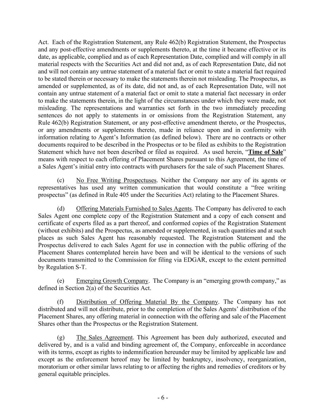 - 6 - Act. Each of the Registration Statement, any Rule 462(b) Registration Statement, the Prospectus and any post-effective amendments or supplements thereto, at the time it became effective or its date, as applicable, complied and as of each Representation Date, complied and will comply in all material respects with the Securities Act and did not and, as of each Representation Date, did not and will not contain any untrue statement of a material fact or omit to state a material fact required to be stated therein or necessary to make the statements therein not misleading. The Prospectus, as amended or supplemented, as of its date, did not and, as of each Representation Date, will not contain any untrue statement of a material fact or omit to state a material fact necessary in order to make the statements therein, in the light of the circumstances under which they were made, not misleading. The representations and warranties set forth in the two immediately preceding sentences do not apply to statements in or omissions from the Registration Statement, any Rule 462(b) Registration Statement, or any post-effective amendment thereto, or the Prospectus, or any amendments or supplements thereto, made in reliance upon and in conformity with information relating to Agent’s Information (as defined below). There are no contracts or other documents required to be described in the Prospectus or to be filed as exhibits to the Registration Statement which have not been described or filed as required. As used herein, “Time of Sale” means with respect to each offering of Placement Shares pursuant to this Agreement, the time of a Sales Agent’s initial entry into contracts with purchasers for the sale of such Placement Shares. (c) No Free Writing Prospectuses. Neither the Company nor any of its agents or representatives has used any written communication that would constitute a “free writing prospectus” (as defined in Rule 405 under the Securities Act) relating to the Placement Shares. (d) Offering Materials Furnished to Sales Agents. The Company has delivered to each Sales Agent one complete copy of the Registration Statement and a copy of each consent and certificate of experts filed as a part thereof, and conformed copies of the Registration Statement (without exhibits) and the Prospectus, as amended or supplemented, in such quantities and at such places as such Sales Agent has reasonably requested. The Registration Statement and the Prospectus delivered to each Sales Agent for use in connection with the public offering of the Placement Shares contemplated herein have been and will be identical to the versions of such documents transmitted to the Commission for filing via EDGAR, except to the extent permitted by Regulation S-T. (e) Emerging Growth Company. The Company is an “emerging growth company,” as defined in Section 2(a) of the Securities Act. (f) Distribution of Offering Material By the Company. The Company has not distributed and will not distribute, prior to the completion of the Sales Agents’ distribution of the Placement Shares, any offering material in connection with the offering and sale of the Placement Shares other than the Prospectus or the Registration Statement. (g) The Sales Agreement. This Agreement has been duly authorized, executed and delivered by, and is a valid and binding agreement of, the Company, enforceable in accordance with its terms, except as rights to indemnification hereunder may be limited by applicable law and except as the enforcement hereof may be limited by bankruptcy, insolvency, reorganization, moratorium or other similar laws relating to or affecting the rights and remedies of creditors or by general equitable principles.