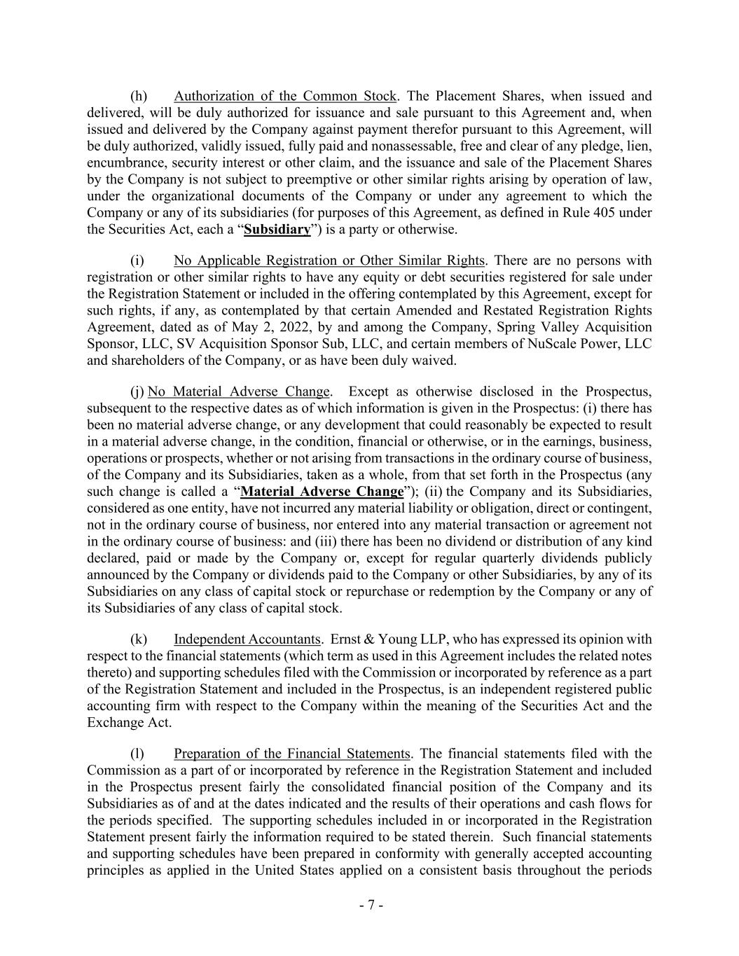 - 7 - (h) Authorization of the Common Stock. The Placement Shares, when issued and delivered, will be duly authorized for issuance and sale pursuant to this Agreement and, when issued and delivered by the Company against payment therefor pursuant to this Agreement, will be duly authorized, validly issued, fully paid and nonassessable, free and clear of any pledge, lien, encumbrance, security interest or other claim, and the issuance and sale of the Placement Shares by the Company is not subject to preemptive or other similar rights arising by operation of law, under the organizational documents of the Company or under any agreement to which the Company or any of its subsidiaries (for purposes of this Agreement, as defined in Rule 405 under the Securities Act, each a “Subsidiary”) is a party or otherwise. (i) No Applicable Registration or Other Similar Rights. There are no persons with registration or other similar rights to have any equity or debt securities registered for sale under the Registration Statement or included in the offering contemplated by this Agreement, except for such rights, if any, as contemplated by that certain Amended and Restated Registration Rights Agreement, dated as of May 2, 2022, by and among the Company, Spring Valley Acquisition Sponsor, LLC, SV Acquisition Sponsor Sub, LLC, and certain members of NuScale Power, LLC and shareholders of the Company, or as have been duly waived. (j) No Material Adverse Change. Except as otherwise disclosed in the Prospectus, subsequent to the respective dates as of which information is given in the Prospectus: (i) there has been no material adverse change, or any development that could reasonably be expected to result in a material adverse change, in the condition, financial or otherwise, or in the earnings, business, operations or prospects, whether or not arising from transactions in the ordinary course of business, of the Company and its Subsidiaries, taken as a whole, from that set forth in the Prospectus (any such change is called a “Material Adverse Change”); (ii) the Company and its Subsidiaries, considered as one entity, have not incurred any material liability or obligation, direct or contingent, not in the ordinary course of business, nor entered into any material transaction or agreement not in the ordinary course of business: and (iii) there has been no dividend or distribution of any kind declared, paid or made by the Company or, except for regular quarterly dividends publicly announced by the Company or dividends paid to the Company or other Subsidiaries, by any of its Subsidiaries on any class of capital stock or repurchase or redemption by the Company or any of its Subsidiaries of any class of capital stock. (k) Independent Accountants. Ernst & Young LLP, who has expressed its opinion with respect to the financial statements (which term as used in this Agreement includes the related notes thereto) and supporting schedules filed with the Commission or incorporated by reference as a part of the Registration Statement and included in the Prospectus, is an independent registered public accounting firm with respect to the Company within the meaning of the Securities Act and the Exchange Act. (l) Preparation of the Financial Statements. The financial statements filed with the Commission as a part of or incorporated by reference in the Registration Statement and included in the Prospectus present fairly the consolidated financial position of the Company and its Subsidiaries as of and at the dates indicated and the results of their operations and cash flows for the periods specified. The supporting schedules included in or incorporated in the Registration Statement present fairly the information required to be stated therein. Such financial statements and supporting schedules have been prepared in conformity with generally accepted accounting principles as applied in the United States applied on a consistent basis throughout the periods