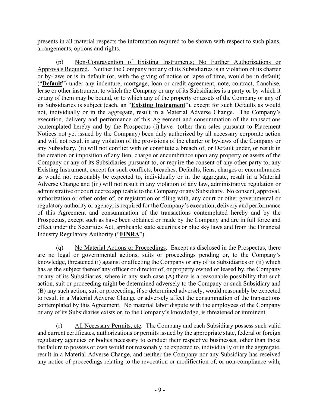 - 9 - presents in all material respects the information required to be shown with respect to such plans, arrangements, options and rights. (p) Non-Contravention of Existing Instruments; No Further Authorizations or Approvals Required. Neither the Company nor any of its Subsidiaries is in violation of its charter or by-laws or is in default (or, with the giving of notice or lapse of time, would be in default) (“Default”) under any indenture, mortgage, loan or credit agreement, note, contract, franchise, lease or other instrument to which the Company or any of its Subsidiaries is a party or by which it or any of them may be bound, or to which any of the property or assets of the Company or any of its Subsidiaries is subject (each, an “Existing Instrument”), except for such Defaults as would not, individually or in the aggregate, result in a Material Adverse Change. The Company’s execution, delivery and performance of this Agreement and consummation of the transactions contemplated hereby and by the Prospectus (i) have (other than sales pursuant to Placement Notices not yet issued by the Company) been duly authorized by all necessary corporate action and will not result in any violation of the provisions of the charter or by-laws of the Company or any Subsidiary, (ii) will not conflict with or constitute a breach of, or Default under, or result in the creation or imposition of any lien, charge or encumbrance upon any property or assets of the Company or any of its Subsidiaries pursuant to, or require the consent of any other party to, any Existing Instrument, except for such conflicts, breaches, Defaults, liens, charges or encumbrances as would not reasonably be expected to, individually or in the aggregate, result in a Material Adverse Change and (iii) will not result in any violation of any law, administrative regulation or administrative or court decree applicable to the Company or any Subsidiary. No consent, approval, authorization or other order of, or registration or filing with, any court or other governmental or regulatory authority or agency, is required for the Company’s execution, delivery and performance of this Agreement and consummation of the transactions contemplated hereby and by the Prospectus, except such as have been obtained or made by the Company and are in full force and effect under the Securities Act, applicable state securities or blue sky laws and from the Financial Industry Regulatory Authority (“FINRA”). (q) No Material Actions or Proceedings. Except as disclosed in the Prospectus, there are no legal or governmental actions, suits or proceedings pending or, to the Company’s knowledge, threatened (i) against or affecting the Company or any of its Subsidiaries or (ii) which has as the subject thereof any officer or director of, or property owned or leased by, the Company or any of its Subsidiaries, where in any such case (A) there is a reasonable possibility that such action, suit or proceeding might be determined adversely to the Company or such Subsidiary and (B) any such action, suit or proceeding, if so determined adversely, would reasonably be expected to result in a Material Adverse Change or adversely affect the consummation of the transactions contemplated by this Agreement. No material labor dispute with the employees of the Company or any of its Subsidiaries exists or, to the Company’s knowledge, is threatened or imminent. (r) All Necessary Permits, etc. The Company and each Subsidiary possess such valid and current certificates, authorizations or permits issued by the appropriate state, federal or foreign regulatory agencies or bodies necessary to conduct their respective businesses, other than those the failure to possess or own would not reasonably be expected to, individually or in the aggregate, result in a Material Adverse Change, and neither the Company nor any Subsidiary has received any notice of proceedings relating to the revocation or modification of, or non-compliance with,