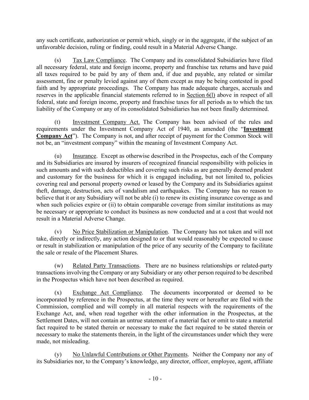 - 10 - any such certificate, authorization or permit which, singly or in the aggregate, if the subject of an unfavorable decision, ruling or finding, could result in a Material Adverse Change. (s) Tax Law Compliance. The Company and its consolidated Subsidiaries have filed all necessary federal, state and foreign income, property and franchise tax returns and have paid all taxes required to be paid by any of them and, if due and payable, any related or similar assessment, fine or penalty levied against any of them except as may be being contested in good faith and by appropriate proceedings. The Company has made adequate charges, accruals and reserves in the applicable financial statements referred to in Section 6(l) above in respect of all federal, state and foreign income, property and franchise taxes for all periods as to which the tax liability of the Company or any of its consolidated Subsidiaries has not been finally determined. (t) Investment Company Act. The Company has been advised of the rules and requirements under the Investment Company Act of 1940, as amended (the “Investment Company Act”). The Company is not, and after receipt of payment for the Common Stock will not be, an “investment company” within the meaning of Investment Company Act. (u) Insurance. Except as otherwise described in the Prospectus, each of the Company and its Subsidiaries are insured by insurers of recognized financial responsibility with policies in such amounts and with such deductibles and covering such risks as are generally deemed prudent and customary for the business for which it is engaged including, but not limited to, policies covering real and personal property owned or leased by the Company and its Subsidiaries against theft, damage, destruction, acts of vandalism and earthquakes. The Company has no reason to believe that it or any Subsidiary will not be able (i) to renew its existing insurance coverage as and when such policies expire or (ii) to obtain comparable coverage from similar institutions as may be necessary or appropriate to conduct its business as now conducted and at a cost that would not result in a Material Adverse Change. (v) No Price Stabilization or Manipulation. The Company has not taken and will not take, directly or indirectly, any action designed to or that would reasonably be expected to cause or result in stabilization or manipulation of the price of any security of the Company to facilitate the sale or resale of the Placement Shares. (w) Related Party Transactions. There are no business relationships or related-party transactions involving the Company or any Subsidiary or any other person required to be described in the Prospectus which have not been described as required. (x) Exchange Act Compliance. The documents incorporated or deemed to be incorporated by reference in the Prospectus, at the time they were or hereafter are filed with the Commission, complied and will comply in all material respects with the requirements of the Exchange Act, and, when read together with the other information in the Prospectus, at the Settlement Dates, will not contain an untrue statement of a material fact or omit to state a material fact required to be stated therein or necessary to make the fact required to be stated therein or necessary to make the statements therein, in the light of the circumstances under which they were made, not misleading. (y) No Unlawful Contributions or Other Payments. Neither the Company nor any of its Subsidiaries nor, to the Company’s knowledge, any director, officer, employee, agent, affiliate