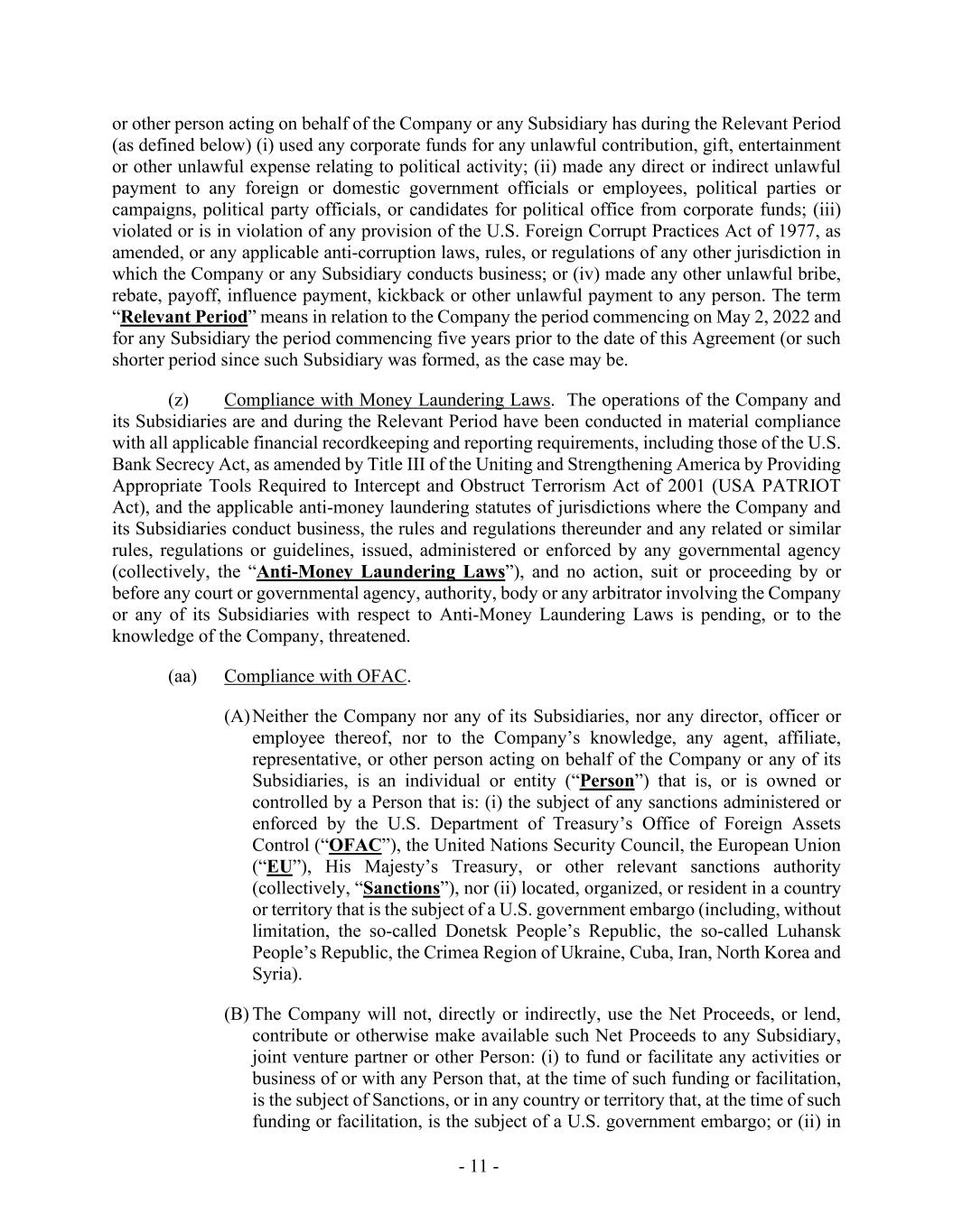 - 11 - or other person acting on behalf of the Company or any Subsidiary has during the Relevant Period (as defined below) (i) used any corporate funds for any unlawful contribution, gift, entertainment or other unlawful expense relating to political activity; (ii) made any direct or indirect unlawful payment to any foreign or domestic government officials or employees, political parties or campaigns, political party officials, or candidates for political office from corporate funds; (iii) violated or is in violation of any provision of the U.S. Foreign Corrupt Practices Act of 1977, as amended, or any applicable anti-corruption laws, rules, or regulations of any other jurisdiction in which the Company or any Subsidiary conducts business; or (iv) made any other unlawful bribe, rebate, payoff, influence payment, kickback or other unlawful payment to any person. The term “Relevant Period” means in relation to the Company the period commencing on May 2, 2022 and for any Subsidiary the period commencing five years prior to the date of this Agreement (or such shorter period since such Subsidiary was formed, as the case may be. (z) Compliance with Money Laundering Laws. The operations of the Company and its Subsidiaries are and during the Relevant Period have been conducted in material compliance with all applicable financial recordkeeping and reporting requirements, including those of the U.S. Bank Secrecy Act, as amended by Title III of the Uniting and Strengthening America by Providing Appropriate Tools Required to Intercept and Obstruct Terrorism Act of 2001 (USA PATRIOT Act), and the applicable anti-money laundering statutes of jurisdictions where the Company and its Subsidiaries conduct business, the rules and regulations thereunder and any related or similar rules, regulations or guidelines, issued, administered or enforced by any governmental agency (collectively, the “Anti-Money Laundering Laws”), and no action, suit or proceeding by or before any court or governmental agency, authority, body or any arbitrator involving the Company or any of its Subsidiaries with respect to Anti-Money Laundering Laws is pending, or to the knowledge of the Company, threatened. (aa) Compliance with OFAC. (A) Neither the Company nor any of its Subsidiaries, nor any director, officer or employee thereof, nor to the Company’s knowledge, any agent, affiliate, representative, or other person acting on behalf of the Company or any of its Subsidiaries, is an individual or entity (“Person”) that is, or is owned or controlled by a Person that is: (i) the subject of any sanctions administered or enforced by the U.S. Department of Treasury’s Office of Foreign Assets Control (“OFAC”), the United Nations Security Council, the European Union (“EU”), His Majesty’s Treasury, or other relevant sanctions authority (collectively, “Sanctions”), nor (ii) located, organized, or resident in a country or territory that is the subject of a U.S. government embargo (including, without limitation, the so-called Donetsk People’s Republic, the so-called Luhansk People’s Republic, the Crimea Region of Ukraine, Cuba, Iran, North Korea and Syria). (B) The Company will not, directly or indirectly, use the Net Proceeds, or lend, contribute or otherwise make available such Net Proceeds to any Subsidiary, joint venture partner or other Person: (i) to fund or facilitate any activities or business of or with any Person that, at the time of such funding or facilitation, is the subject of Sanctions, or in any country or territory that, at the time of such funding or facilitation, is the subject of a U.S. government embargo; or (ii) in