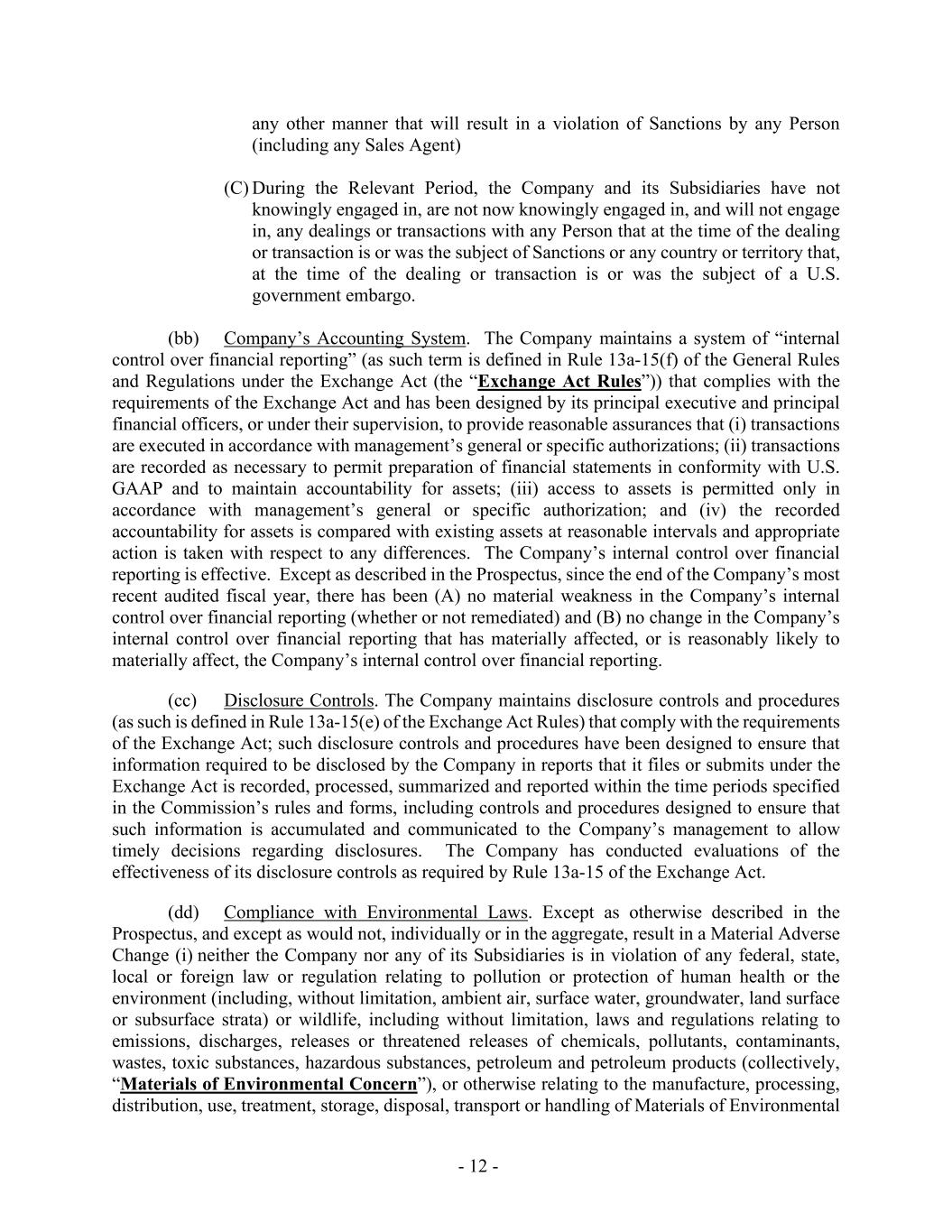 - 12 - any other manner that will result in a violation of Sanctions by any Person (including any Sales Agent) (C) During the Relevant Period, the Company and its Subsidiaries have not knowingly engaged in, are not now knowingly engaged in, and will not engage in, any dealings or transactions with any Person that at the time of the dealing or transaction is or was the subject of Sanctions or any country or territory that, at the time of the dealing or transaction is or was the subject of a U.S. government embargo. (bb) Company’s Accounting System. The Company maintains a system of “internal control over financial reporting” (as such term is defined in Rule 13a-15(f) of the General Rules and Regulations under the Exchange Act (the “Exchange Act Rules”)) that complies with the requirements of the Exchange Act and has been designed by its principal executive and principal financial officers, or under their supervision, to provide reasonable assurances that (i) transactions are executed in accordance with management’s general or specific authorizations; (ii) transactions are recorded as necessary to permit preparation of financial statements in conformity with U.S. GAAP and to maintain accountability for assets; (iii) access to assets is permitted only in accordance with management’s general or specific authorization; and (iv) the recorded accountability for assets is compared with existing assets at reasonable intervals and appropriate action is taken with respect to any differences. The Company’s internal control over financial reporting is effective. Except as described in the Prospectus, since the end of the Company’s most recent audited fiscal year, there has been (A) no material weakness in the Company’s internal control over financial reporting (whether or not remediated) and (B) no change in the Company’s internal control over financial reporting that has materially affected, or is reasonably likely to materially affect, the Company’s internal control over financial reporting. (cc) Disclosure Controls. The Company maintains disclosure controls and procedures (as such is defined in Rule 13a-15(e) of the Exchange Act Rules) that comply with the requirements of the Exchange Act; such disclosure controls and procedures have been designed to ensure that information required to be disclosed by the Company in reports that it files or submits under the Exchange Act is recorded, processed, summarized and reported within the time periods specified in the Commission’s rules and forms, including controls and procedures designed to ensure that such information is accumulated and communicated to the Company’s management to allow timely decisions regarding disclosures. The Company has conducted evaluations of the effectiveness of its disclosure controls as required by Rule 13a-15 of the Exchange Act. (dd) Compliance with Environmental Laws. Except as otherwise described in the Prospectus, and except as would not, individually or in the aggregate, result in a Material Adverse Change (i) neither the Company nor any of its Subsidiaries is in violation of any federal, state, local or foreign law or regulation relating to pollution or protection of human health or the environment (including, without limitation, ambient air, surface water, groundwater, land surface or subsurface strata) or wildlife, including without limitation, laws and regulations relating to emissions, discharges, releases or threatened releases of chemicals, pollutants, contaminants, wastes, toxic substances, hazardous substances, petroleum and petroleum products (collectively, “Materials of Environmental Concern”), or otherwise relating to the manufacture, processing, distribution, use, treatment, storage, disposal, transport or handling of Materials of Environmental