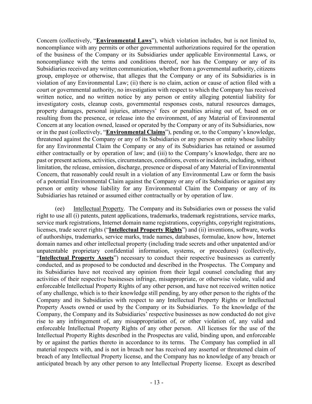 - 13 - Concern (collectively, “Environmental Laws”), which violation includes, but is not limited to, noncompliance with any permits or other governmental authorizations required for the operation of the business of the Company or its Subsidiaries under applicable Environmental Laws, or noncompliance with the terms and conditions thereof, nor has the Company or any of its Subsidiaries received any written communication, whether from a governmental authority, citizens group, employee or otherwise, that alleges that the Company or any of its Subsidiaries is in violation of any Environmental Law; (ii) there is no claim, action or cause of action filed with a court or governmental authority, no investigation with respect to which the Company has received written notice, and no written notice by any person or entity alleging potential liability for investigatory costs, cleanup costs, governmental responses costs, natural resources damages, property damages, personal injuries, attorneys’ fees or penalties arising out of, based on or resulting from the presence, or release into the environment, of any Material of Environmental Concern at any location owned, leased or operated by the Company or any of its Subsidiaries, now or in the past (collectively, “Environmental Claims”), pending or, to the Company’s knowledge, threatened against the Company or any of its Subsidiaries or any person or entity whose liability for any Environmental Claim the Company or any of its Subsidiaries has retained or assumed either contractually or by operation of law; and (iii) to the Company’s knowledge, there are no past or present actions, activities, circumstances, conditions, events or incidents, including, without limitation, the release, emission, discharge, presence or disposal of any Material of Environmental Concern, that reasonably could result in a violation of any Environmental Law or form the basis of a potential Environmental Claim against the Company or any of its Subsidiaries or against any person or entity whose liability for any Environmental Claim the Company or any of its Subsidiaries has retained or assumed either contractually or by operation of law. (ee) Intellectual Property. The Company and its Subsidiaries own or possess the valid right to use all (i) patents, patent applications, trademarks, trademark registrations, service marks, service mark registrations, Internet domain name registrations, copyrights, copyright registrations, licenses, trade secret rights (“Intellectual Property Rights”) and (ii) inventions, software, works of authorships, trademarks, service marks, trade names, databases, formulae, know how, Internet domain names and other intellectual property (including trade secrets and other unpatented and/or unpatentable proprietary confidential information, systems, or procedures) (collectively, “Intellectual Property Assets”) necessary to conduct their respective businesses as currently conducted, and as proposed to be conducted and described in the Prospectus. The Company and its Subsidiaries have not received any opinion from their legal counsel concluding that any activities of their respective businesses infringe, misappropriate, or otherwise violate, valid and enforceable Intellectual Property Rights of any other person, and have not received written notice of any challenge, which is to their knowledge still pending, by any other person to the rights of the Company and its Subsidiaries with respect to any Intellectual Property Rights or Intellectual Property Assets owned or used by the Company or its Subsidiaries. To the knowledge of the Company, the Company and its Subsidiaries’ respective businesses as now conducted do not give rise to any infringement of, any misappropriation of, or other violation of, any valid and enforceable Intellectual Property Rights of any other person. All licenses for the use of the Intellectual Property Rights described in the Prospectus are valid, binding upon, and enforceable by or against the parties thereto in accordance to its terms. The Company has complied in all material respects with, and is not in breach nor has received any asserted or threatened claim of breach of any Intellectual Property license, and the Company has no knowledge of any breach or anticipated breach by any other person to any Intellectual Property license. Except as described