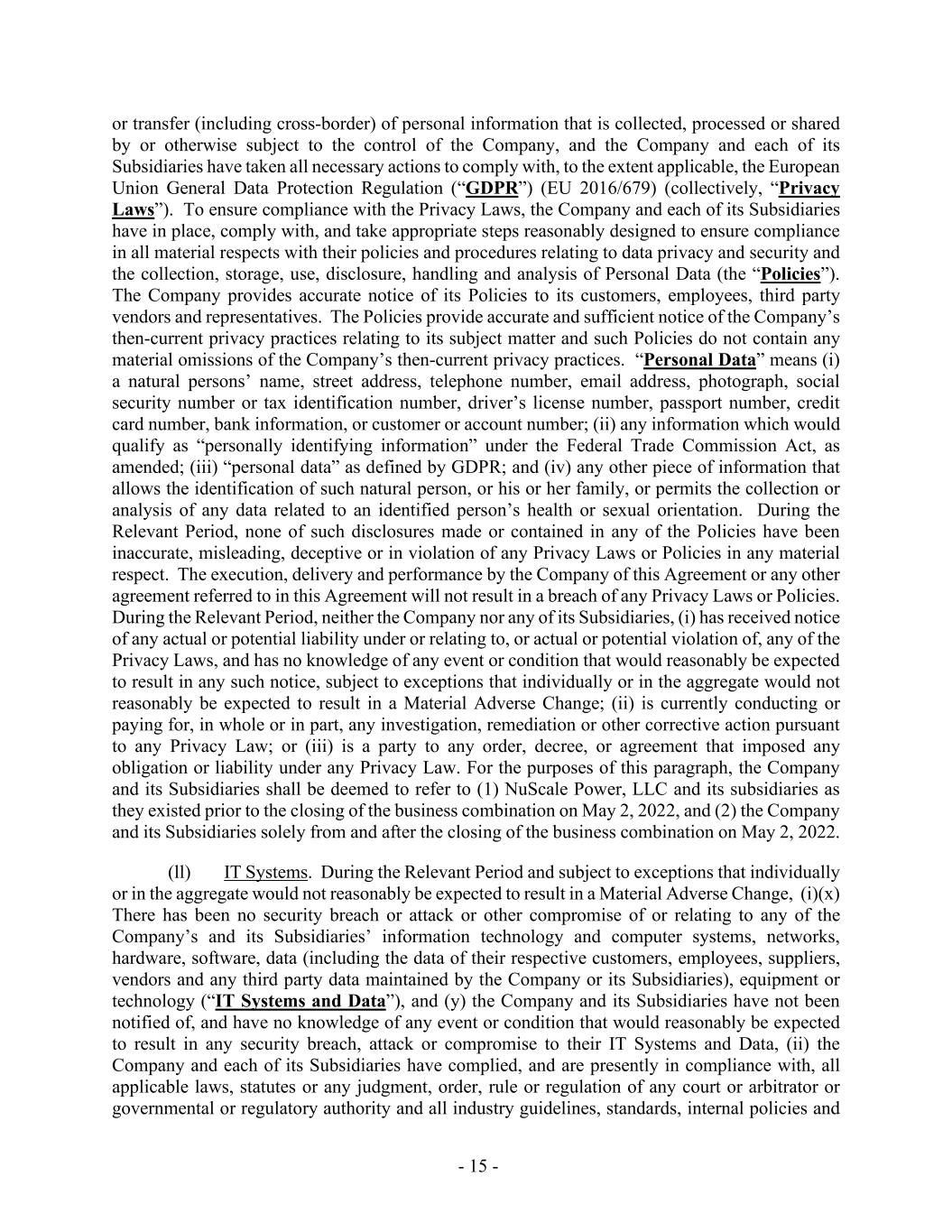 - 15 - or transfer (including cross-border) of personal information that is collected, processed or shared by or otherwise subject to the control of the Company, and the Company and each of its Subsidiaries have taken all necessary actions to comply with, to the extent applicable, the European Union General Data Protection Regulation (“GDPR”) (EU 2016/679) (collectively, “Privacy Laws”). To ensure compliance with the Privacy Laws, the Company and each of its Subsidiaries have in place, comply with, and take appropriate steps reasonably designed to ensure compliance in all material respects with their policies and procedures relating to data privacy and security and the collection, storage, use, disclosure, handling and analysis of Personal Data (the “Policies”). The Company provides accurate notice of its Policies to its customers, employees, third party vendors and representatives. The Policies provide accurate and sufficient notice of the Company’s then-current privacy practices relating to its subject matter and such Policies do not contain any material omissions of the Company’s then-current privacy practices. “Personal Data” means (i) a natural persons’ name, street address, telephone number, email address, photograph, social security number or tax identification number, driver’s license number, passport number, credit card number, bank information, or customer or account number; (ii) any information which would qualify as “personally identifying information” under the Federal Trade Commission Act, as amended; (iii) “personal data” as defined by GDPR; and (iv) any other piece of information that allows the identification of such natural person, or his or her family, or permits the collection or analysis of any data related to an identified person’s health or sexual orientation. During the Relevant Period, none of such disclosures made or contained in any of the Policies have been inaccurate, misleading, deceptive or in violation of any Privacy Laws or Policies in any material respect. The execution, delivery and performance by the Company of this Agreement or any other agreement referred to in this Agreement will not result in a breach of any Privacy Laws or Policies. During the Relevant Period, neither the Company nor any of its Subsidiaries, (i) has received notice of any actual or potential liability under or relating to, or actual or potential violation of, any of the Privacy Laws, and has no knowledge of any event or condition that would reasonably be expected to result in any such notice, subject to exceptions that individually or in the aggregate would not reasonably be expected to result in a Material Adverse Change; (ii) is currently conducting or paying for, in whole or in part, any investigation, remediation or other corrective action pursuant to any Privacy Law; or (iii) is a party to any order, decree, or agreement that imposed any obligation or liability under any Privacy Law. For the purposes of this paragraph, the Company and its Subsidiaries shall be deemed to refer to (1) NuScale Power, LLC and its subsidiaries as they existed prior to the closing of the business combination on May 2, 2022, and (2) the Company and its Subsidiaries solely from and after the closing of the business combination on May 2, 2022. (ll) IT Systems. During the Relevant Period and subject to exceptions that individually or in the aggregate would not reasonably be expected to result in a Material Adverse Change, (i)(x) There has been no security breach or attack or other compromise of or relating to any of the Company’s and its Subsidiaries’ information technology and computer systems, networks, hardware, software, data (including the data of their respective customers, employees, suppliers, vendors and any third party data maintained by the Company or its Subsidiaries), equipment or technology (“IT Systems and Data”), and (y) the Company and its Subsidiaries have not been notified of, and have no knowledge of any event or condition that would reasonably be expected to result in any security breach, attack or compromise to their IT Systems and Data, (ii) the Company and each of its Subsidiaries have complied, and are presently in compliance with, all applicable laws, statutes or any judgment, order, rule or regulation of any court or arbitrator or governmental or regulatory authority and all industry guidelines, standards, internal policies and