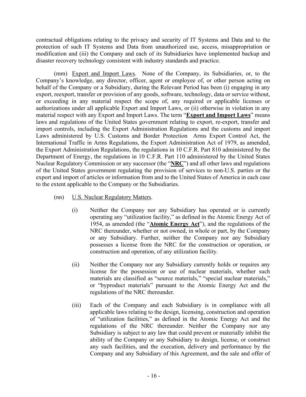 - 16 - contractual obligations relating to the privacy and security of IT Systems and Data and to the protection of such IT Systems and Data from unauthorized use, access, misappropriation or modification and (iii) the Company and each of its Subsidiaries have implemented backup and disaster recovery technology consistent with industry standards and practice. (mm) Export and Import Laws. None of the Company, its Subsidiaries, or, to the Company’s knowledge, any director, officer, agent or employee of, or other person acting on behalf of the Company or a Subsidiary, during the Relevant Period has been (i) engaging in any export, reexport, transfer or provision of any goods, software, technology, data or service without, or exceeding in any material respect the scope of, any required or applicable licenses or authorizations under all applicable Export and Import Laws, or (ii) otherwise in violation in any material respect with any Export and Import Laws. The term “Export and Import Laws” means laws and regulations of the United States government relating to export, re-export, transfer and import controls, including the Export Administration Regulations and the customs and import Laws administered by U.S. Customs and Border Protection Arms Export Control Act, the International Traffic in Arms Regulations, the Export Administration Act of 1979, as amended, the Export Administration Regulations, the regulations in 10 C.F.R. Part 810 administered by the Department of Energy, the regulations in 10 C.F.R. Part 110 administered by the United States Nuclear Regulatory Commission or any successor (the “NRC”) and all other laws and regulations of the United States government regulating the provision of services to non-U.S. parties or the export and import of articles or information from and to the United States of America in each case to the extent applicable to the Company or the Subsidiaries. (nn) U.S. Nuclear Regulatory Matters. (i) Neither the Company nor any Subsidiary has operated or is currently operating any “utilization facility,” as defined in the Atomic Energy Act of 1954, as amended (the “Atomic Energy Act”), and the regulations of the NRC thereunder, whether or not owned, in whole or part, by the Company or any Subsidiary. Further, neither the Company nor any Subsidiary possesses a license from the NRC for the construction or operation, or construction and operation, of any utilization facility. (ii) Neither the Company nor any Subsidiary currently holds or requires any license for the possession or use of nuclear materials, whether such materials are classified as “source materials,” “special nuclear materials,” or “byproduct materials” pursuant to the Atomic Energy Act and the regulations of the NRC thereunder. (iii) Each of the Company and each Subsidiary is in compliance with all applicable laws relating to the design, licensing, construction and operation of “utilization facilities,” as defined in the Atomic Energy Act and the regulations of the NRC thereunder. Neither the Company nor any Subsidiary is subject to any law that could prevent or materially inhibit the ability of the Company or any Subsidiary to design, license, or construct any such facilities, and the execution, delivery and performance by the Company and any Subsidiary of this Agreement, and the sale and offer of