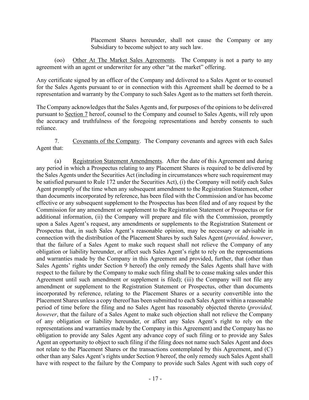 - 17 - Placement Shares hereunder, shall not cause the Company or any Subsidiary to become subject to any such law. (oo) Other At The Market Sales Agreements. The Company is not a party to any agreement with an agent or underwriter for any other “at the market” offering. Any certificate signed by an officer of the Company and delivered to a Sales Agent or to counsel for the Sales Agents pursuant to or in connection with this Agreement shall be deemed to be a representation and warranty by the Company to such Sales Agent as to the matters set forth therein. The Company acknowledges that the Sales Agents and, for purposes of the opinions to be delivered pursuant to Section 7 hereof, counsel to the Company and counsel to Sales Agents, will rely upon the accuracy and truthfulness of the foregoing representations and hereby consents to such reliance. 7. Covenants of the Company. The Company covenants and agrees with each Sales Agent that: (a) Registration Statement Amendments. After the date of this Agreement and during any period in which a Prospectus relating to any Placement Shares is required to be delivered by the Sales Agents under the Securities Act (including in circumstances where such requirement may be satisfied pursuant to Rule 172 under the Securities Act), (i) the Company will notify each Sales Agent promptly of the time when any subsequent amendment to the Registration Statement, other than documents incorporated by reference, has been filed with the Commission and/or has become effective or any subsequent supplement to the Prospectus has been filed and of any request by the Commission for any amendment or supplement to the Registration Statement or Prospectus or for additional information, (ii) the Company will prepare and file with the Commission, promptly upon a Sales Agent’s request, any amendments or supplements to the Registration Statement or Prospectus that, in such Sales Agent’s reasonable opinion, may be necessary or advisable in connection with the distribution of the Placement Shares by such Sales Agent (provided, however, that the failure of a Sales Agent to make such request shall not relieve the Company of any obligation or liability hereunder, or affect such Sales Agent’s right to rely on the representations and warranties made by the Company in this Agreement and provided, further, that (other than Sales Agents’ rights under Section 9 hereof) the only remedy the Sales Agents shall have with respect to the failure by the Company to make such filing shall be to cease making sales under this Agreement until such amendment or supplement is filed); (iii) the Company will not file any amendment or supplement to the Registration Statement or Prospectus, other than documents incorporated by reference, relating to the Placement Shares or a security convertible into the Placement Shares unless a copy thereof has been submitted to each Sales Agent within a reasonable period of time before the filing and no Sales Agent has reasonably objected thereto (provided, however, that the failure of a Sales Agent to make such objection shall not relieve the Company of any obligation or liability hereunder, or affect any Sales Agent’s right to rely on the representations and warranties made by the Company in this Agreement) and the Company has no obligation to provide any Sales Agent any advance copy of such filing or to provide any Sales Agent an opportunity to object to such filing if the filing does not name such Sales Agent and does not relate to the Placement Shares or the transactions contemplated by this Agreement, and (C) other than any Sales Agent’s rights under Section 9 hereof, the only remedy such Sales Agent shall have with respect to the failure by the Company to provide such Sales Agent with such copy of