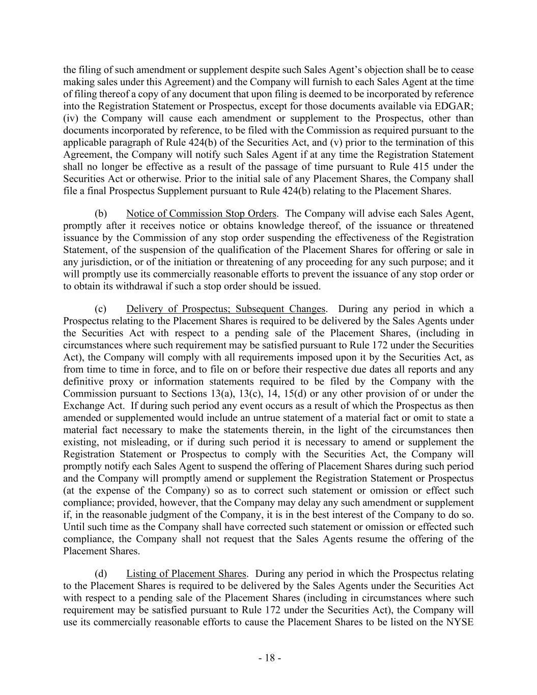 - 18 - the filing of such amendment or supplement despite such Sales Agent’s objection shall be to cease making sales under this Agreement) and the Company will furnish to each Sales Agent at the time of filing thereof a copy of any document that upon filing is deemed to be incorporated by reference into the Registration Statement or Prospectus, except for those documents available via EDGAR; (iv) the Company will cause each amendment or supplement to the Prospectus, other than documents incorporated by reference, to be filed with the Commission as required pursuant to the applicable paragraph of Rule 424(b) of the Securities Act, and (v) prior to the termination of this Agreement, the Company will notify such Sales Agent if at any time the Registration Statement shall no longer be effective as a result of the passage of time pursuant to Rule 415 under the Securities Act or otherwise. Prior to the initial sale of any Placement Shares, the Company shall file a final Prospectus Supplement pursuant to Rule 424(b) relating to the Placement Shares. (b) Notice of Commission Stop Orders. The Company will advise each Sales Agent, promptly after it receives notice or obtains knowledge thereof, of the issuance or threatened issuance by the Commission of any stop order suspending the effectiveness of the Registration Statement, of the suspension of the qualification of the Placement Shares for offering or sale in any jurisdiction, or of the initiation or threatening of any proceeding for any such purpose; and it will promptly use its commercially reasonable efforts to prevent the issuance of any stop order or to obtain its withdrawal if such a stop order should be issued. (c) Delivery of Prospectus; Subsequent Changes. During any period in which a Prospectus relating to the Placement Shares is required to be delivered by the Sales Agents under the Securities Act with respect to a pending sale of the Placement Shares, (including in circumstances where such requirement may be satisfied pursuant to Rule 172 under the Securities Act), the Company will comply with all requirements imposed upon it by the Securities Act, as from time to time in force, and to file on or before their respective due dates all reports and any definitive proxy or information statements required to be filed by the Company with the Commission pursuant to Sections 13(a), 13(c), 14, 15(d) or any other provision of or under the Exchange Act. If during such period any event occurs as a result of which the Prospectus as then amended or supplemented would include an untrue statement of a material fact or omit to state a material fact necessary to make the statements therein, in the light of the circumstances then existing, not misleading, or if during such period it is necessary to amend or supplement the Registration Statement or Prospectus to comply with the Securities Act, the Company will promptly notify each Sales Agent to suspend the offering of Placement Shares during such period and the Company will promptly amend or supplement the Registration Statement or Prospectus (at the expense of the Company) so as to correct such statement or omission or effect such compliance; provided, however, that the Company may delay any such amendment or supplement if, in the reasonable judgment of the Company, it is in the best interest of the Company to do so. Until such time as the Company shall have corrected such statement or omission or effected such compliance, the Company shall not request that the Sales Agents resume the offering of the Placement Shares. (d) Listing of Placement Shares. During any period in which the Prospectus relating to the Placement Shares is required to be delivered by the Sales Agents under the Securities Act with respect to a pending sale of the Placement Shares (including in circumstances where such requirement may be satisfied pursuant to Rule 172 under the Securities Act), the Company will use its commercially reasonable efforts to cause the Placement Shares to be listed on the NYSE